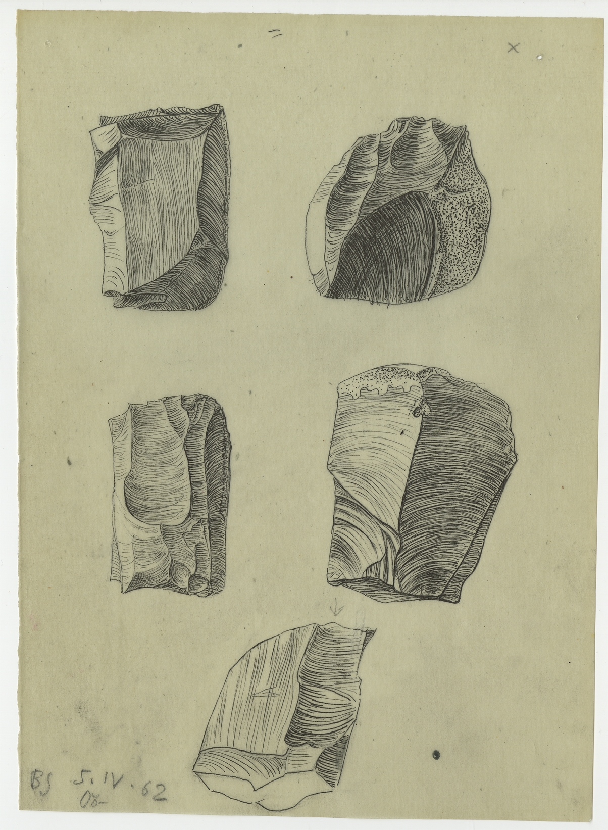 Zbiór próbnych rysunków zabytków krzemiennych wykonanych przez B. Sielewicz na 27 kalkach zebranych w jednej kopercie opisanej ręką Stefana Krukowskiego ok. 1962 r. - kalka 18: 5 rysunków wyrobów krzemiennych z podpisem "BS 5.IV.62 Oo"