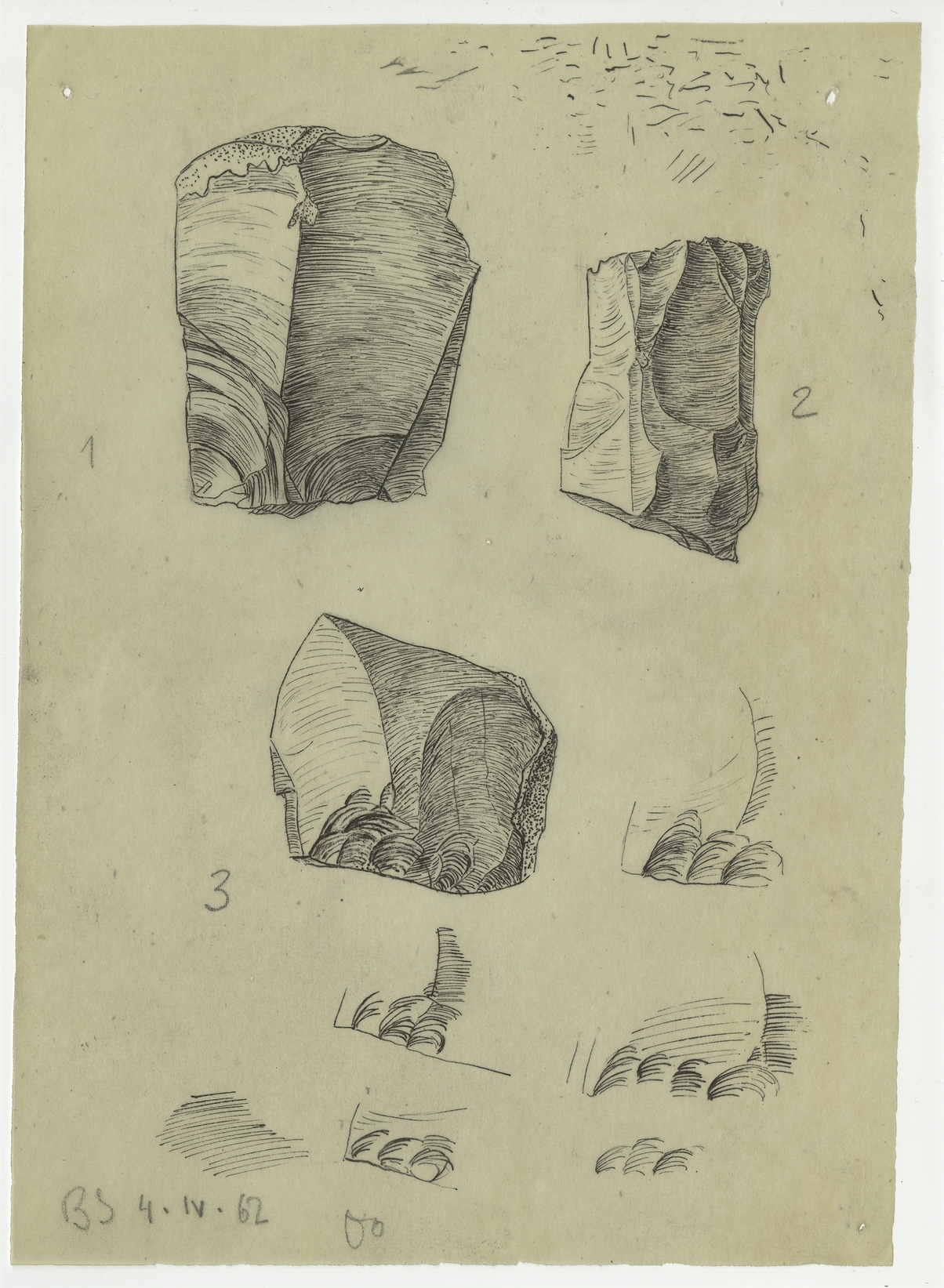 Zbiór próbnych rysunków zabytków krzemiennych wykonanych przez B. Sielewicz na 27 kalkach zebranych w jednej kopercie opisanej ręką Stefana Krukowskiego ok. 1962 r. - kalka 19: 3 rysunki wyrobów krzemiennych wraz z próbnymi rysunkami schematycznymi oraz podpisem "BS 4.IV.62 Oo"