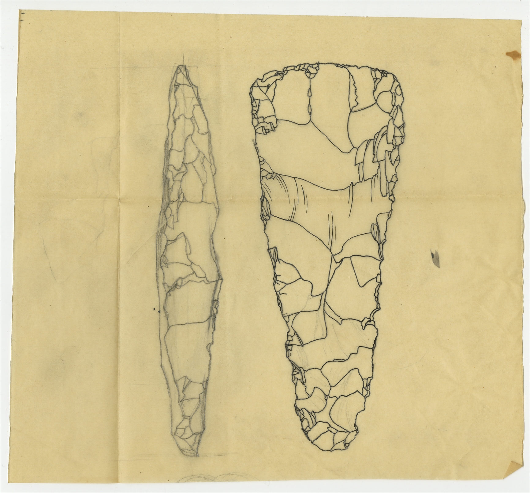 Zbiór próbnych rysunków zabytków krzemiennych wykonanych przez B. Sielewicz na 27 kalkach zebranych w jednej kopercie opisanej ręką Stefana Krukowskiego ok. 1962 r. - kalka 2: rysunek siekiery krzemiennej w dwóch rzutach brak sygnatur