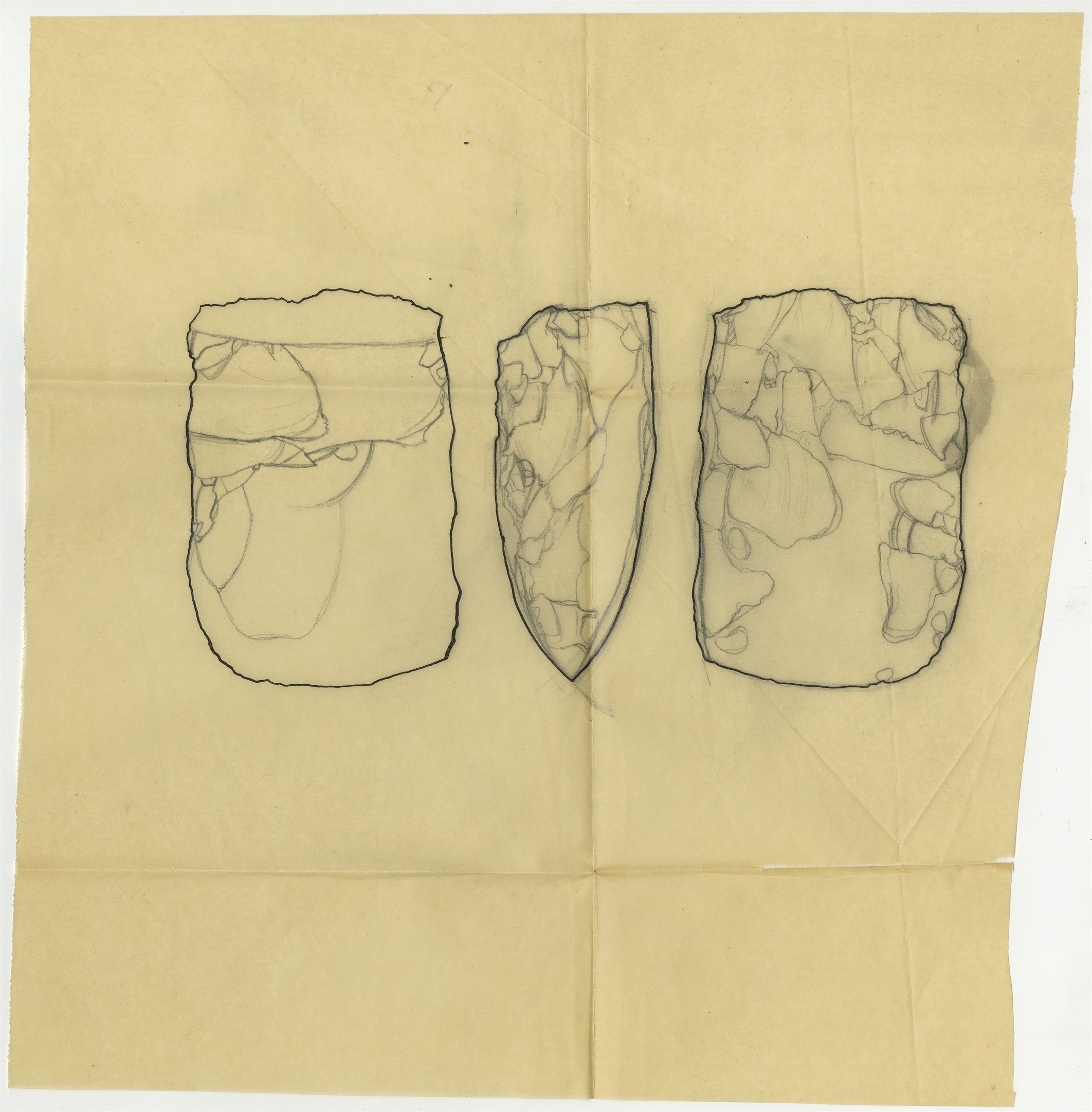 Zbiór próbnych rysunków zabytków krzemiennych wykonanych przez B. Sielewicz na 27 kalkach zebranych w jednej kopercie opisanej ręką Stefana Krukowskiego ok. 1962 r. - kalka 6: rysunek siekiery krzemiennej w trzech rzutach brak sygnatur