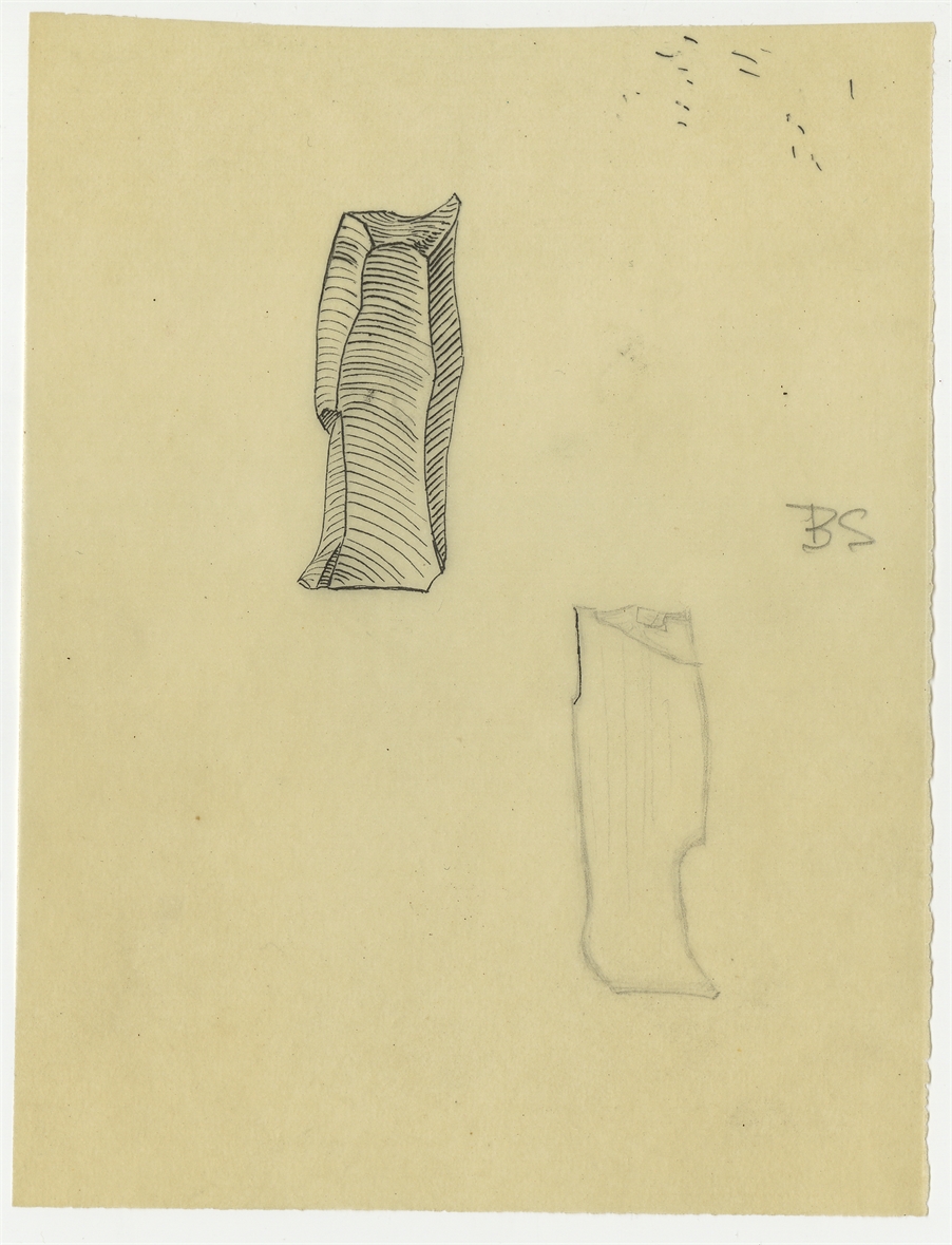 Zbiór próbnych rysunków zabytków krzemiennych wykonanych przez B. Sielewicz na 27 kalkach zebranych w jednej kopercie opisanej ręką Stefana Krukowskiego ok. 1962 r. - kalka 8: 2 rysunki wyrobu krzemiennego (w tym jeden schematyczny olówkiem) z podpisem "BS"