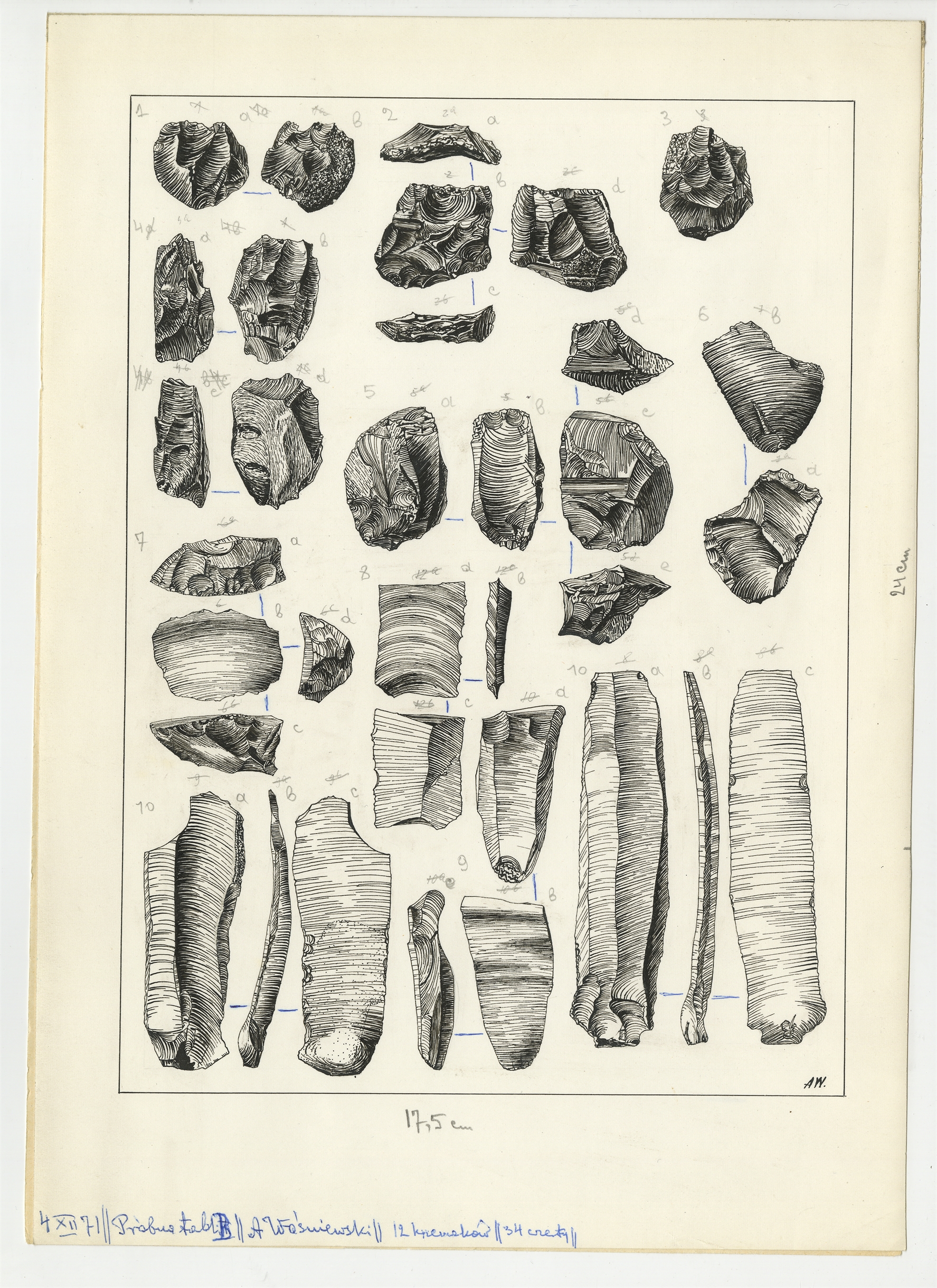 Zbiór rysunków oraz tablic ukazujących zabytki krzemienne o nieznanej proweniencji sporządzonych przez A. Waśniewskiego w 1971 i 1972 r. - strona 6: tablica z 12 krzemakami pt. "Próbna tabl. B" 4 XII [19]71 r.