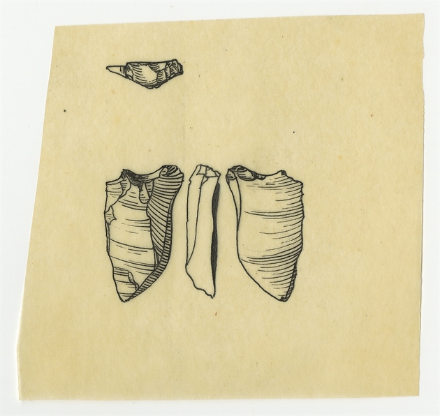 Zbiór rysunków zabytków krzemiennych (15 szt.) wykonanych ręką NN na 15 kalkach stanowiących materiał ilustracyjny do pracy naukowej Stefana Krukowskiego pt. "Przemysł płudzki" - rysunek 13: 1 zabytek krzemienny w czterech rzutach