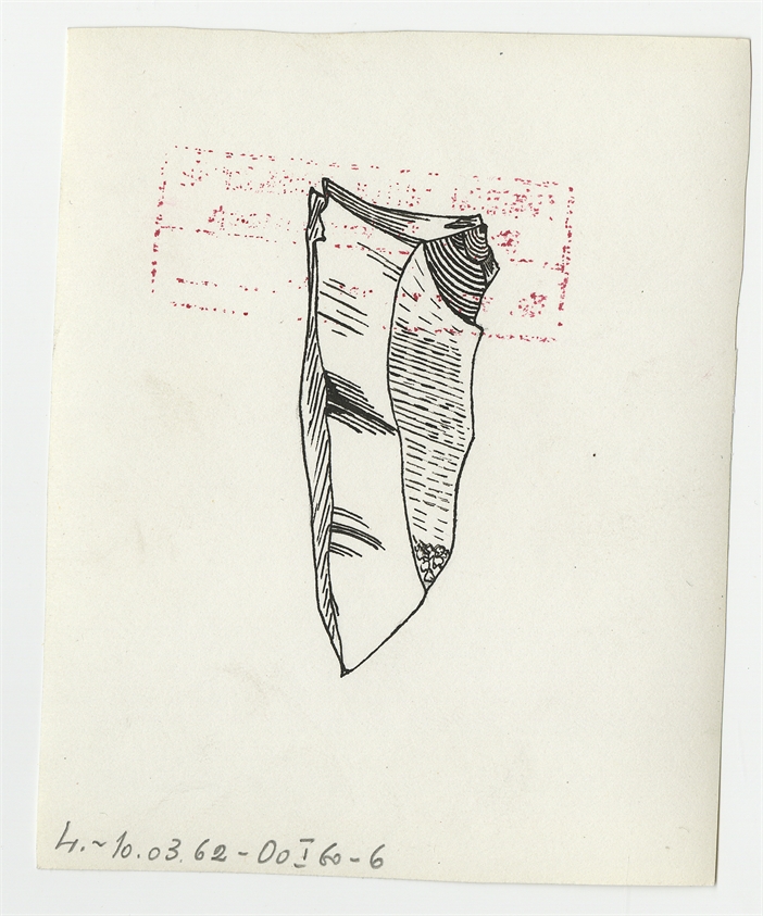 Zbiór rysunków zabytków krzemiennych (5 szt.) zebranych w jednej kopercie opsanej inicjałami "A.F." sporządzonych 10 marca 1962 r. - rysunek 4: zabytek krzemienny wraz z podpisem "4. ~10.03.62 - Oo I 60-6"