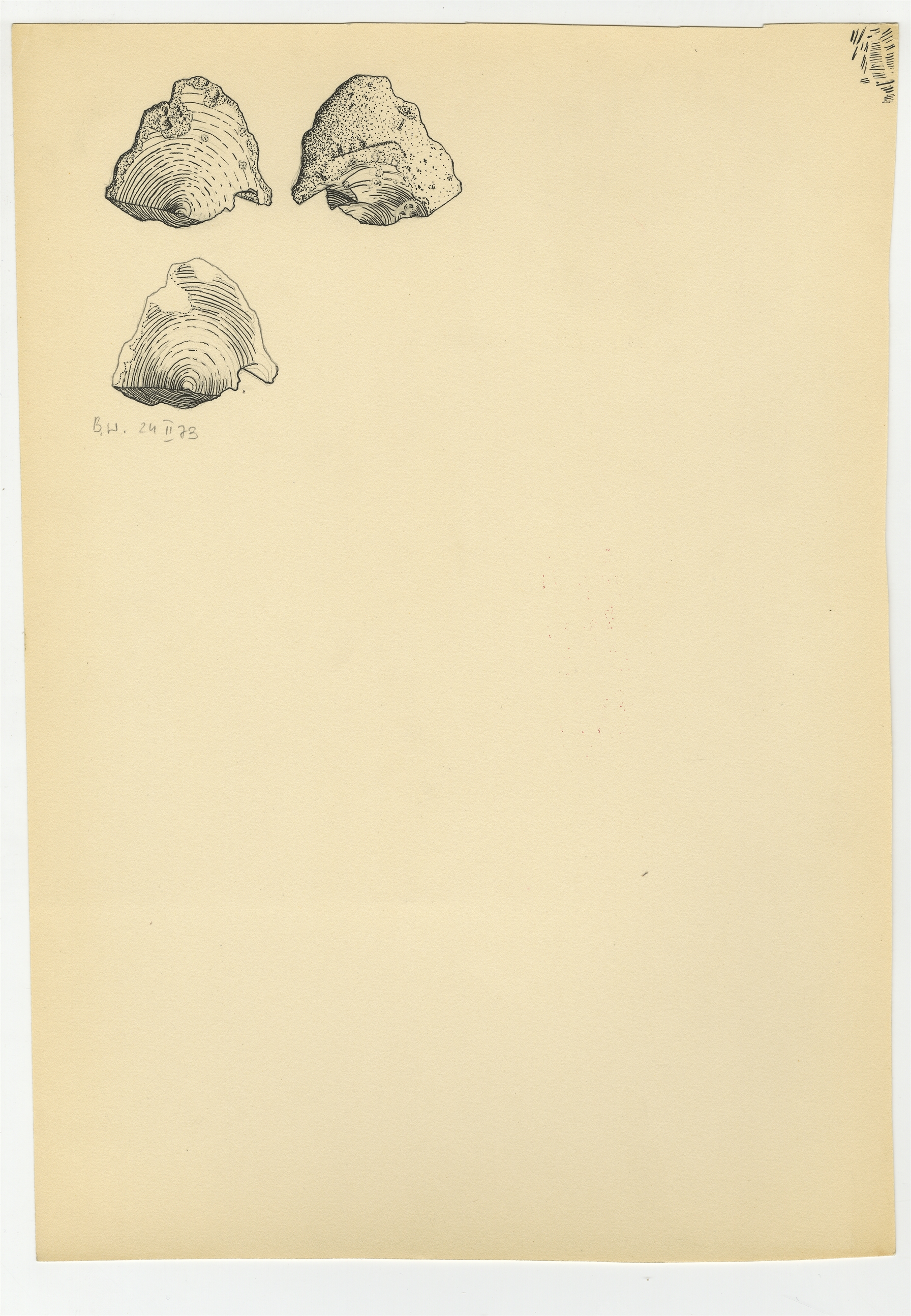 Zbiór rysunków zabytków krzemiennych o nieznanej proweniencji - strona 11: rysunki próbne zabytku krzemiennego w dwóch rzutach (jeden rzut narysowano dwa razy) z podpisem "B.W. 24 II 73"