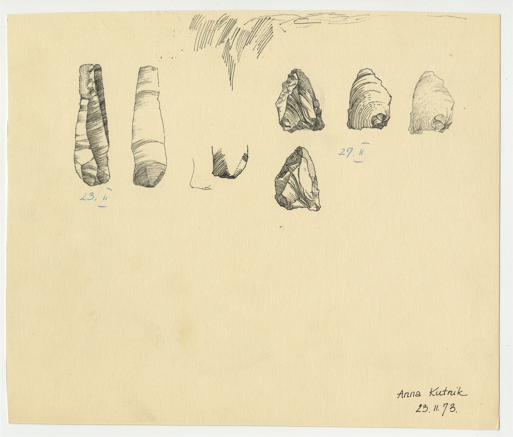 Zbiór rysunków zabytków krzemiennych o nieznanej proweniencji - strona 16: rysunki próbne dwóch zabytków krzemiennych w dwóch rzutach wykonane przez Annę Kutnik 23 i 27 II [19]73 r.