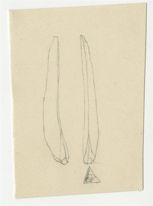 Zbiór rysunków zabytków krzemiennych o nieznanej proweniencji wykanane przez K. Sicińskiego - strona 1: rysunek zabytku krzemiennego w trzech rzutach (ołówkiem)