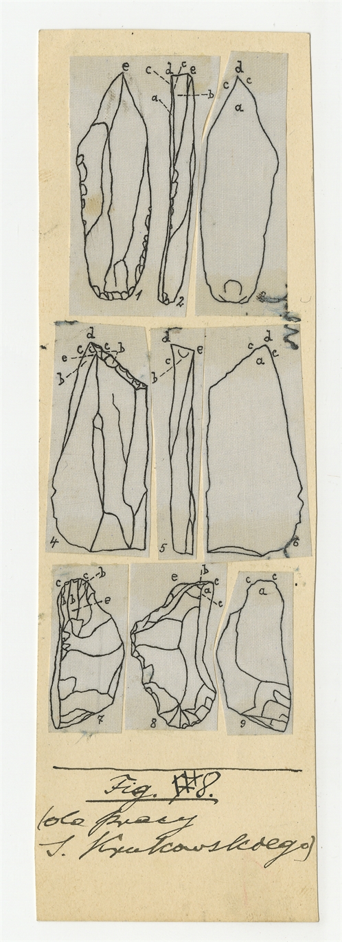 Zbiór rysunków zabytków krzemiennych oraz fotografie noży tokarskich do nieokreślonej pracy Stefana Krukowskiego - strona 13: rysunki narzędzi krzemiennych z podpisem "Fig. 8 do pracy S. Krukowskiego"
