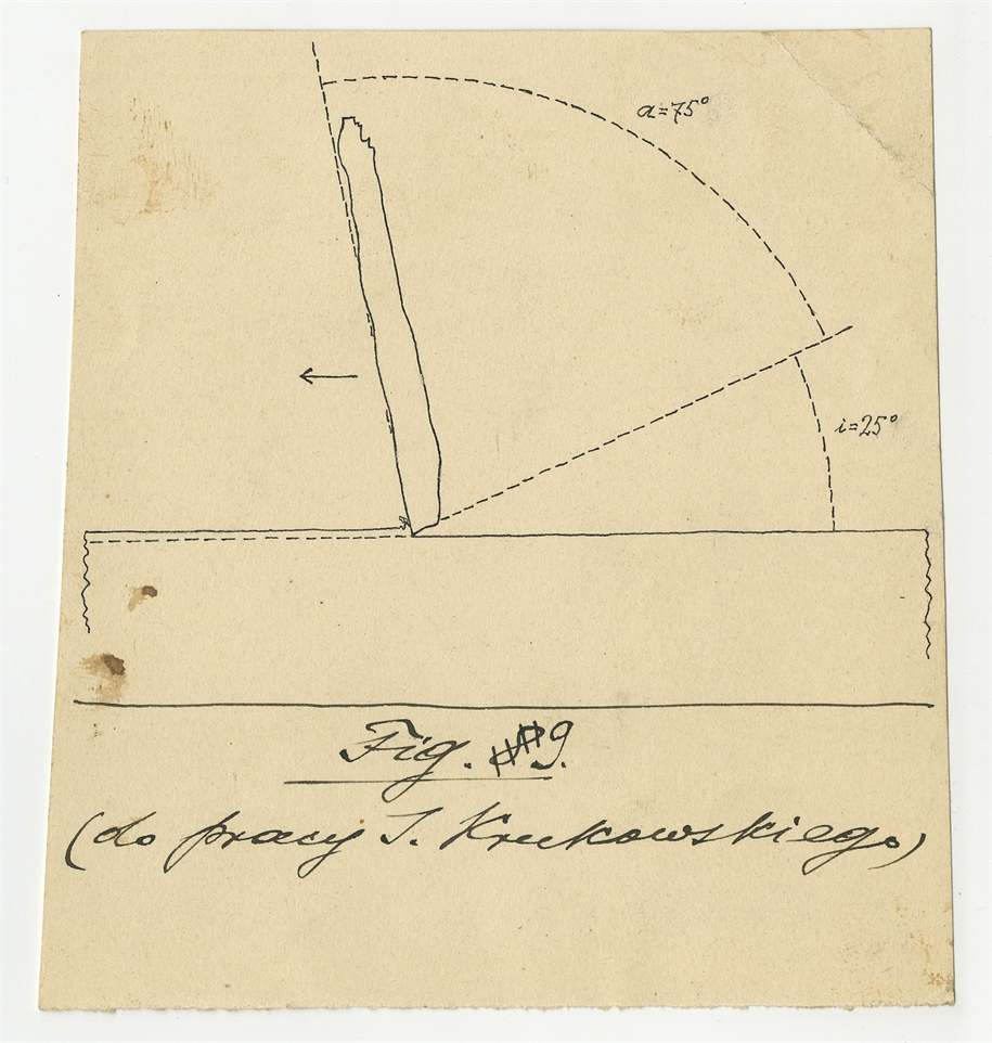 Zbiór rysunków zabytków krzemiennych oraz fotografie noży tokarskich do nieokreślonej pracy Stefana Krukowskiego - strona 14: schemat rysunkowy ukazujący sposób pracy rylca z podpisem "Fig. 9 (do pracy S. Krukowskiego"