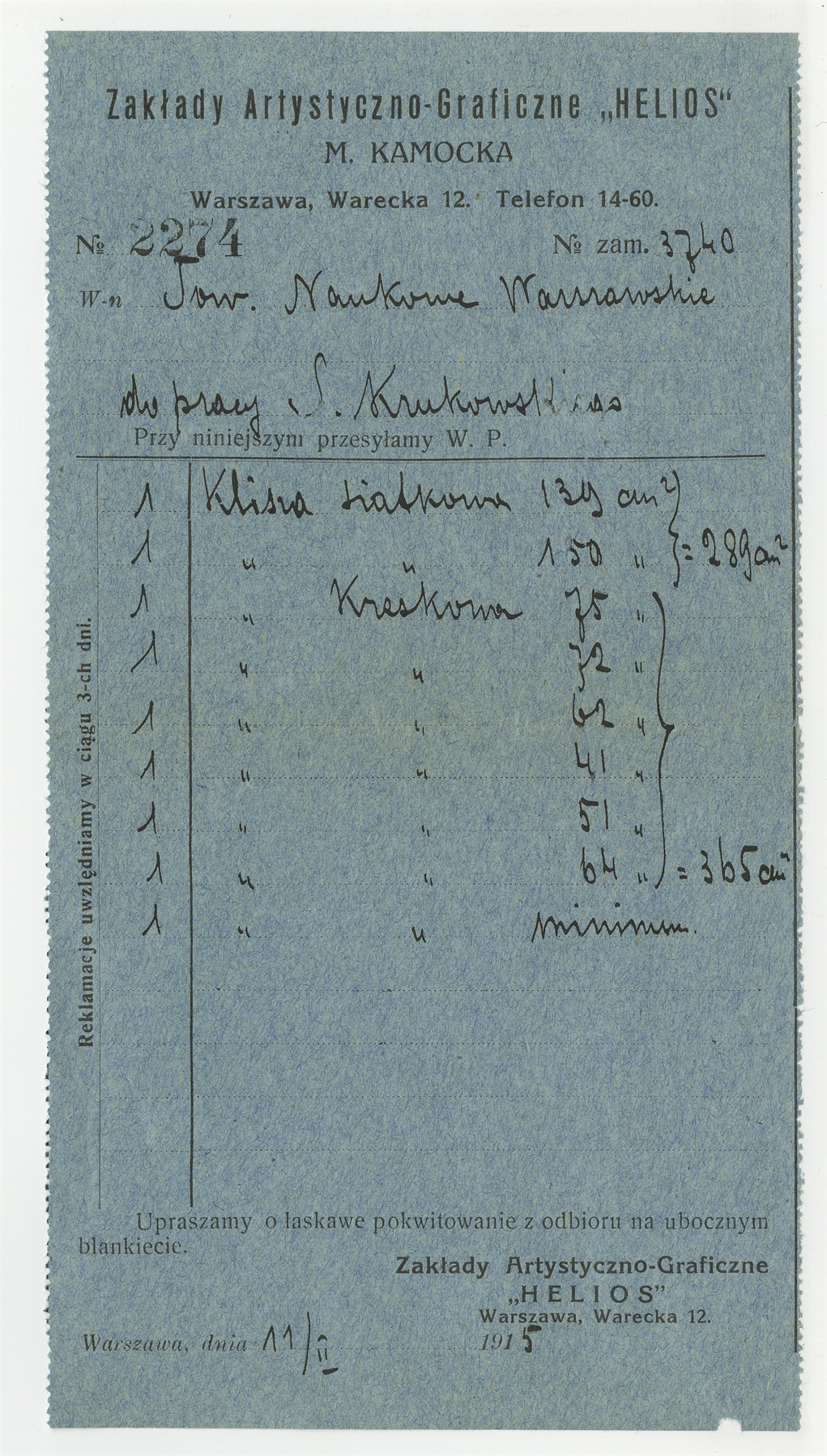 Zbiór rysunków zabytków krzemiennych oraz fotografie noży tokarskich do nieokreślonej pracy Stefana Krukowskiego - strona 15: druczek z wykazem klisz z Zakładu Artystyczno-Graficznego "Helios" 11 II 1915 r.