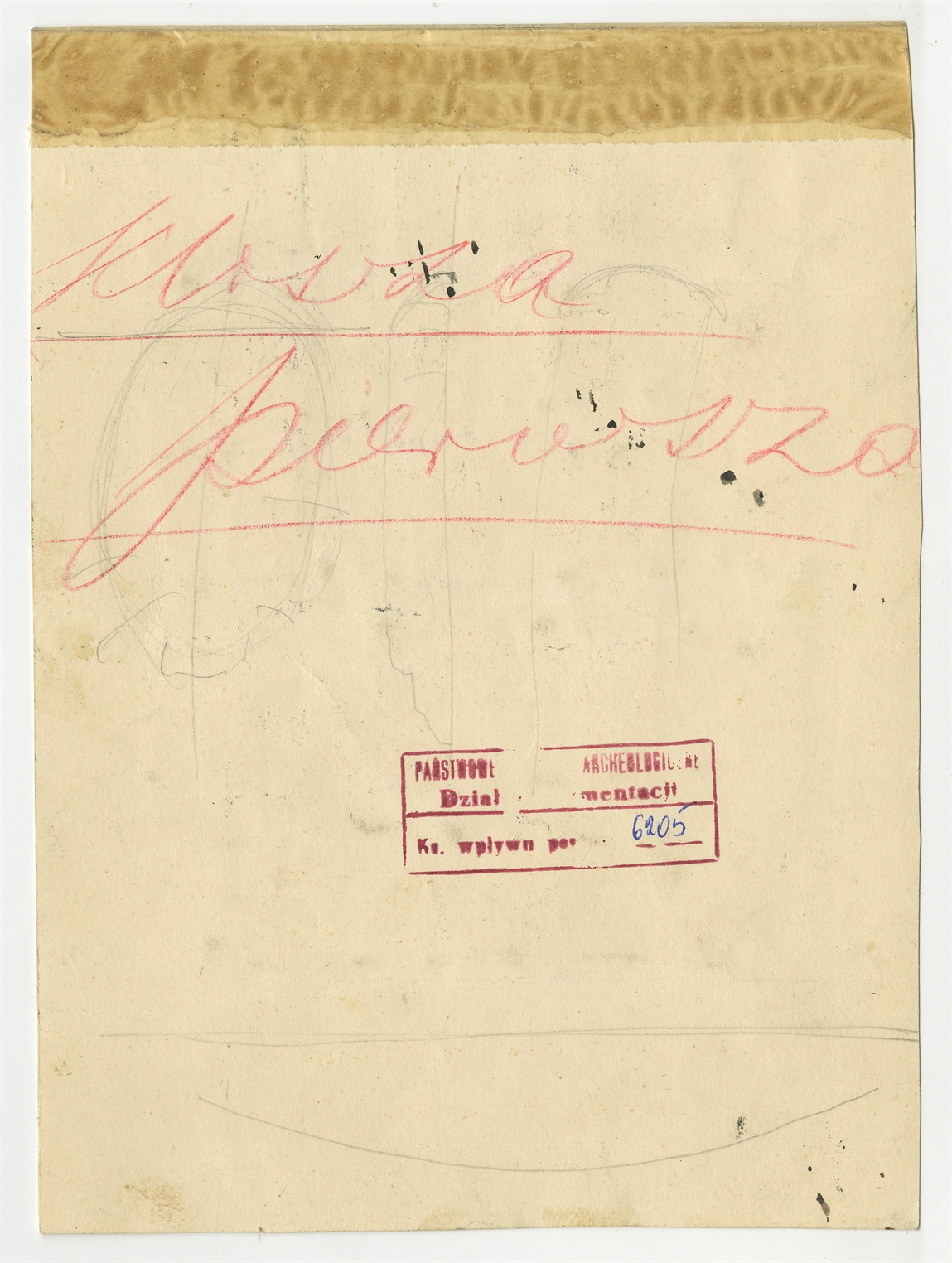 Zbiór rysunków zabytków krzemiennych oraz fotografie noży tokarskich do nieokreślonej pracy Stefana Krukowskiego - strona 17: rewers tablicy w wersji roboczej z rysunkami 19 narzędzi krzemiennych (nr rycin 1-47) z napisem "klisza pierwsza"