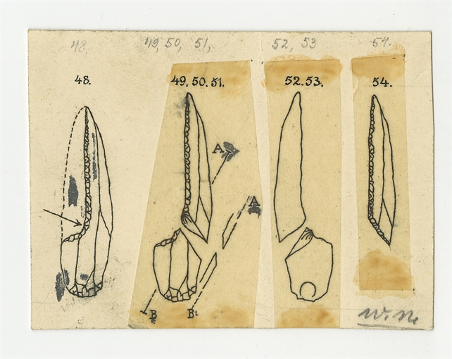 Zbiór rysunków zabytków krzemiennych oraz fotografie noży tokarskich do nieokreślonej pracy Stefana Krukowskiego - strona 19: rysunek w wersji roboczej ukazujący etapy powstawania narzędzia krzemiennego (nr rycin 48-54) - awers