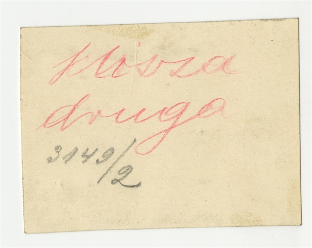 Zbiór rysunków zabytków krzemiennych oraz fotografie noży tokarskich do nieokreślonej pracy Stefana Krukowskiego - strona 20: rewers rysunku w wersji roboczej ukazującego etapy powstawania narzędzia krzemiennego z napisem "klisza druga 3149/2"