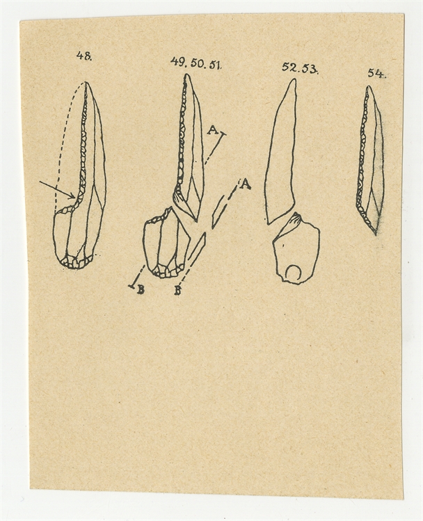 Zbiór rysunków zabytków krzemiennych oraz fotografie noży tokarskich do nieokreślonej pracy Stefana Krukowskiego - strona 21: rysunek w wersji końcowej ukazujący etapy powstawania narzędzia krzemiennego (nr rycin 48-54)