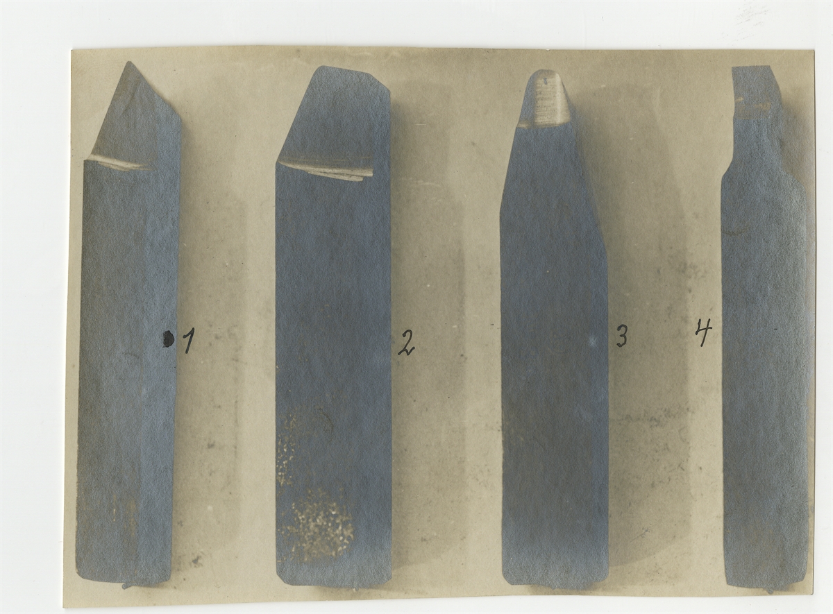Zbiór rysunków zabytków krzemiennych oraz fotografie noży tokarskich do nieokreślonej pracy Stefana Krukowskiego - strona 7: fotografia noży tokarskich (rylców) stanowiąca rycinę nr 4 - awers