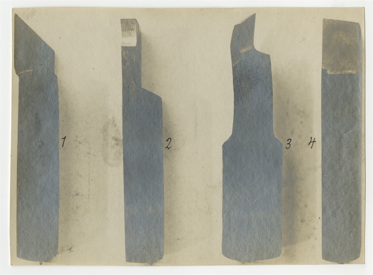 Zbiór rysunków zabytków krzemiennych oraz fotografie noży tokarskich do nieokreślonej pracy Stefana Krukowskiego - strona 9: fotografia noży tokarskich (rylców) stanowiąca rycinę nr 5 - awers