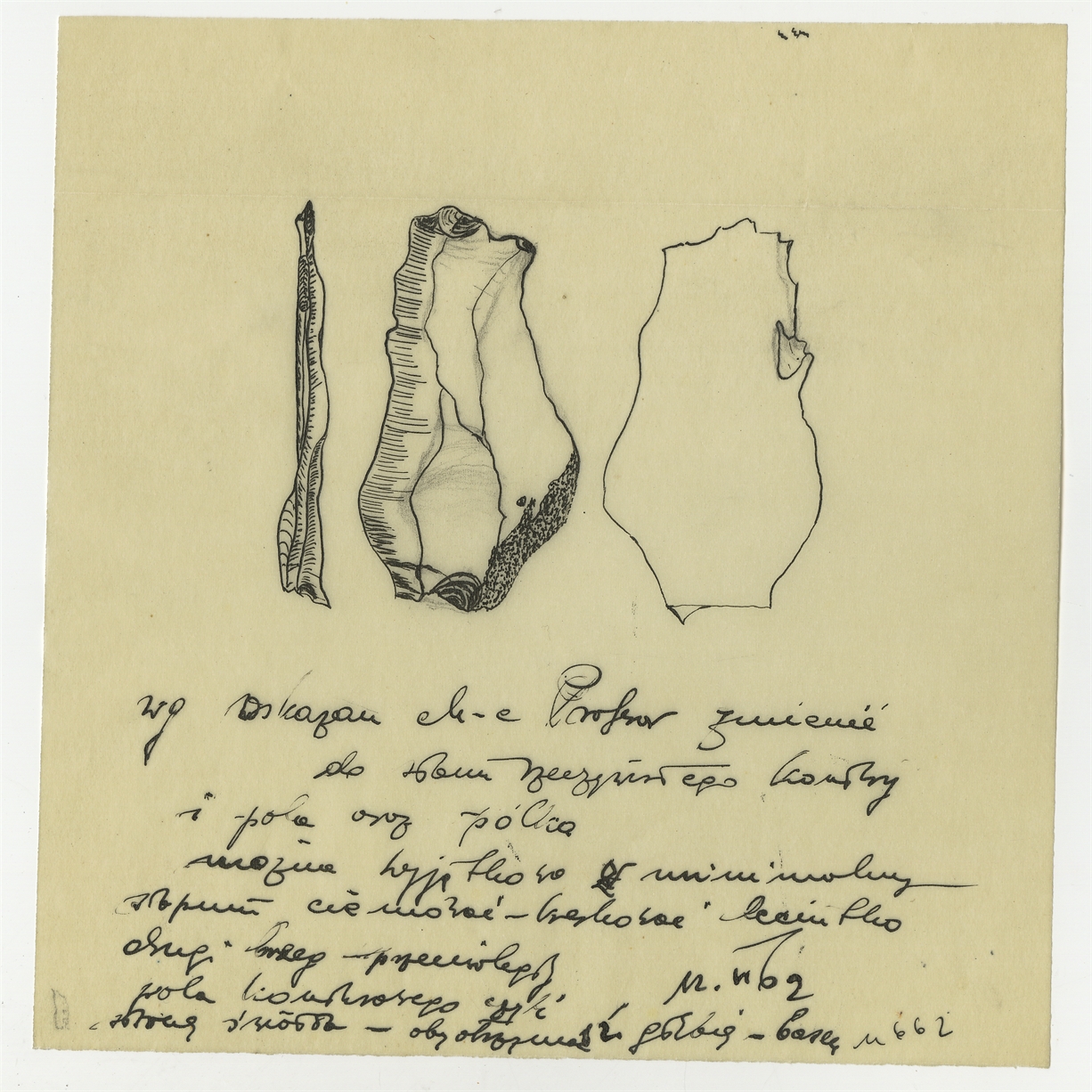 Zbiór rysunków zabytków krzemiennych wykonanych na 35 kalkach przez Z. Szmita oraz J. Morgana w okresie maj-lipiec 1962 r. - kalka 10: rysunek zabytku krzemiennego w trzech rzutach wraz z odręcznymi notatkami 12 VI [19]62