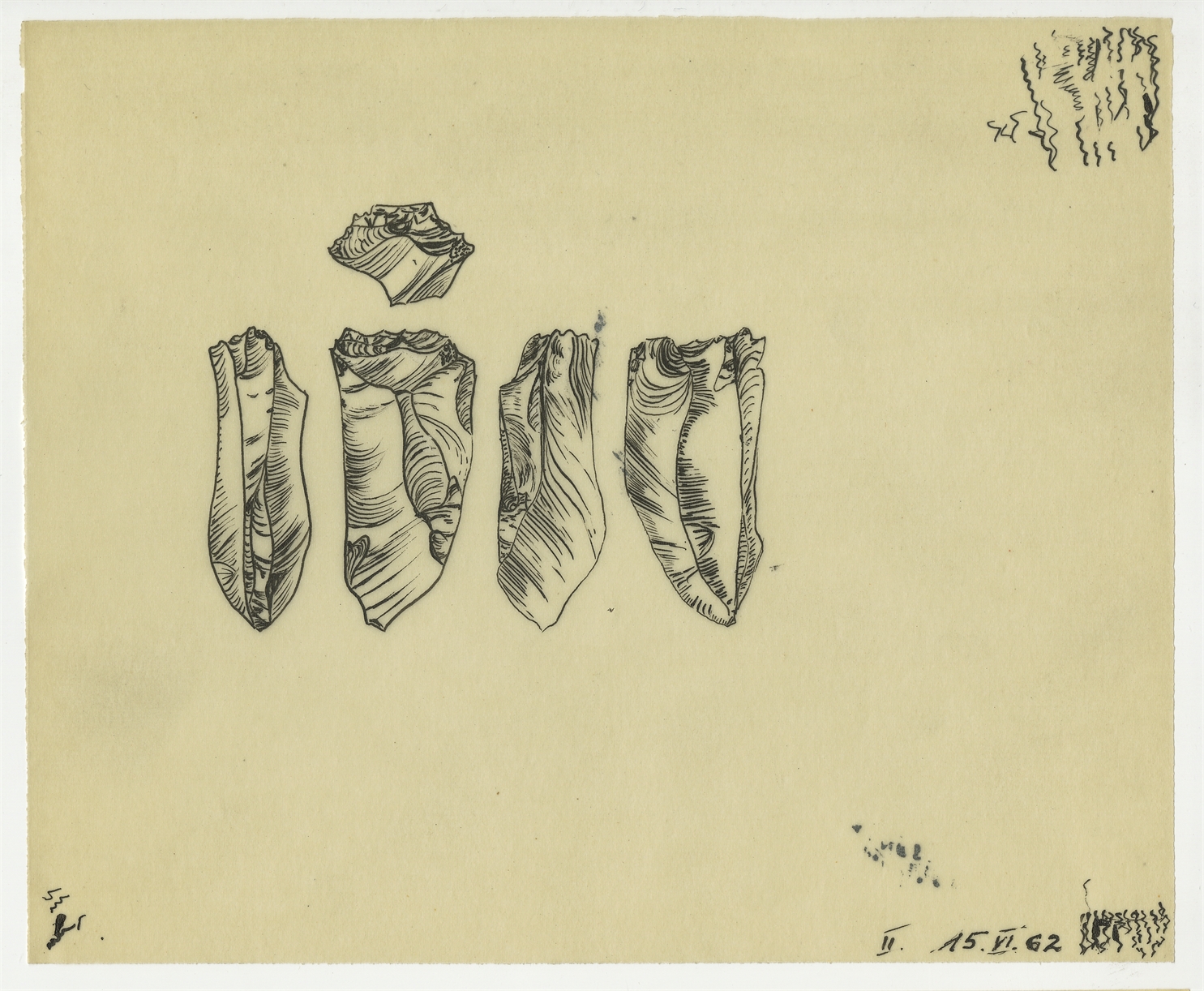 Zbiór rysunków zabytków krzemiennych wykonanych na 35 kalkach przez Z. Szmita oraz J. Morgana w okresie maj-lipiec 1962 r. - kalka 12: rysunek zabytku krzemiennego w pięciu rzutach 15 VI [19]62