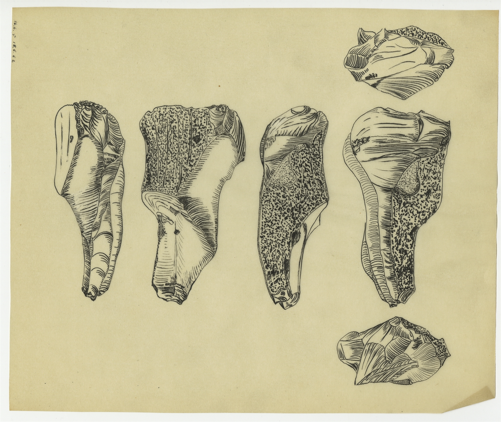 Zbiór rysunków zabytków krzemiennych wykonanych na 35 kalkach przez Z. Szmita oraz J. Morgana w okresie maj-lipiec 1962 r. - kalka 15: rysunek zabytku krzemiennego w sześciu rzutach 16.6. i 18.6. [19]62