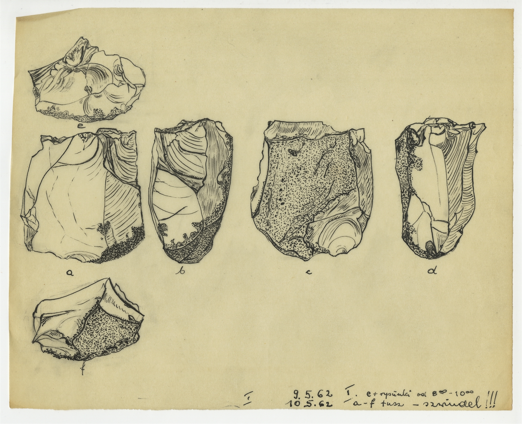 Zbiór rysunków zabytków krzemiennych wykonanych na 35 kalkach przez Z. Szmita oraz J. Morgana w okresie maj-lipiec 1962 r. - kalka 2: rysunek zabytku krzemiennego w sześciu rzutach (a-f) 9-10.5.[19]62