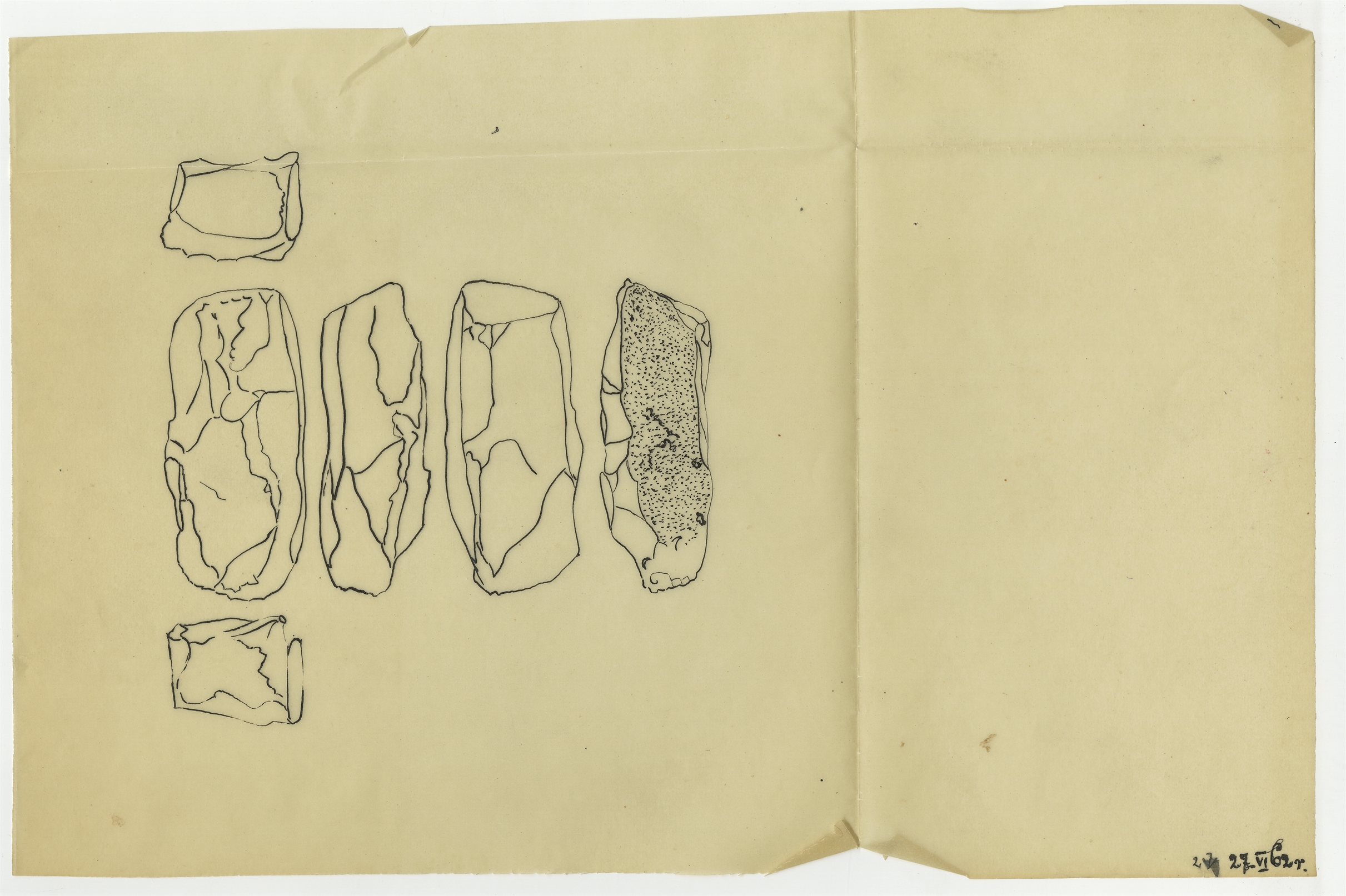 Zbiór rysunków zabytków krzemiennych wykonanych na 35 kalkach przez Z. Szmita oraz J. Morgana w okresie maj-lipiec 1962 r. - kalka 20: rysunek zabytku krzemiennego w sześciu rzutach 27 VI [19]62