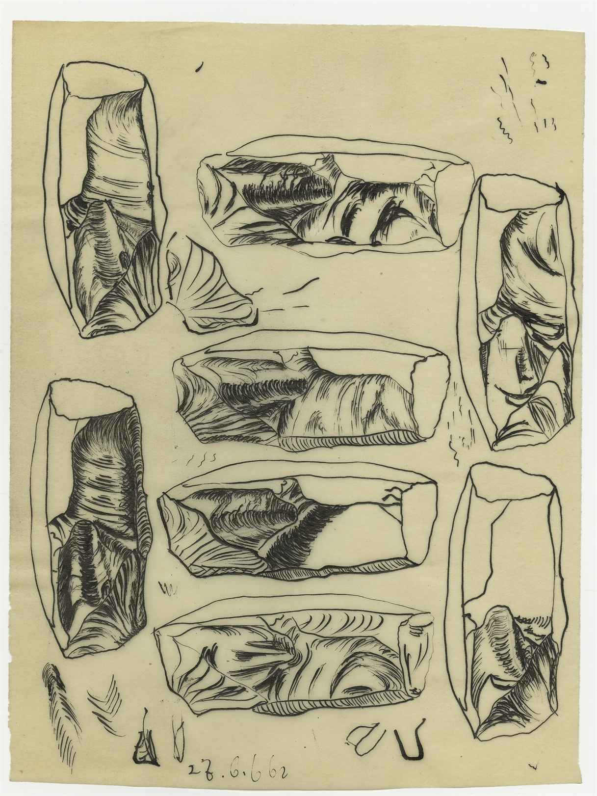 Zbiór rysunków zabytków krzemiennych wykonanych na 35 kalkach przez Z. Szmita oraz J. Morgana w okresie maj-lipiec 1962 r. - kalka 21: rysunek zabytku krzemiennego (osiem razy ten sam rzut) 27.6.[19]62