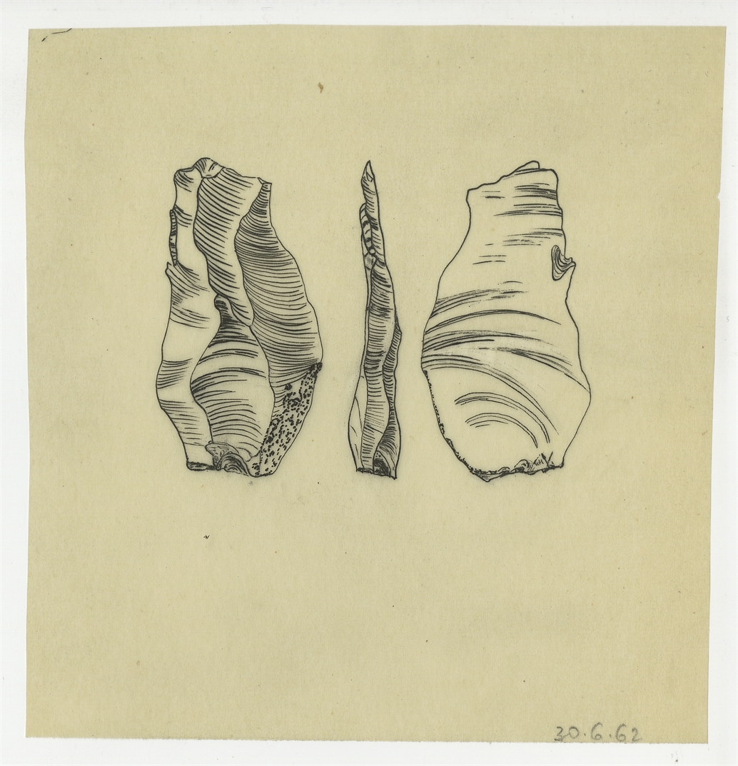 Zbiór rysunków zabytków krzemiennych wykonanych na 35 kalkach przez Z. Szmita oraz J. Morgana w okresie maj-lipiec 1962 r. - kalka 25: rysunek zabytku krzemiennego w trzech rzutach 30.6.[19]62