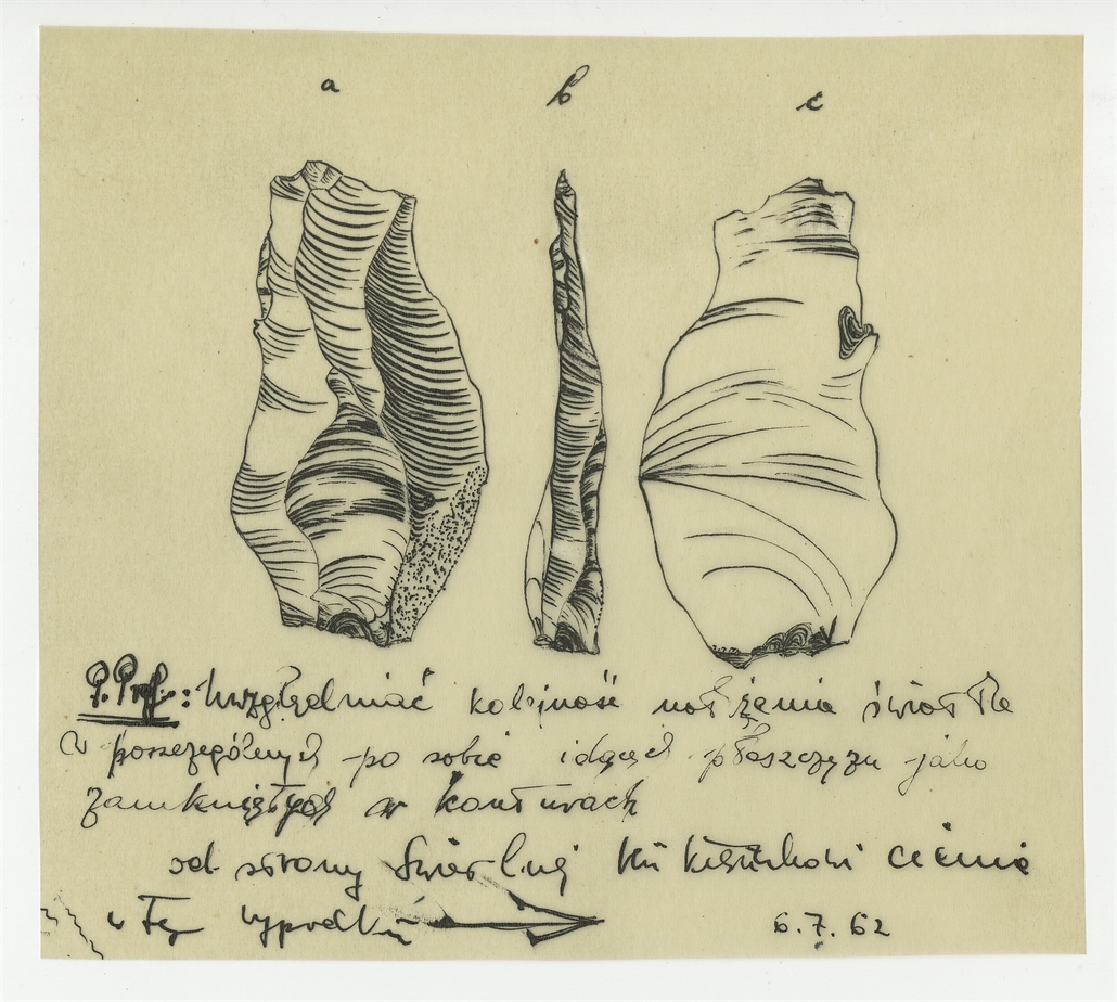 Zbiór rysunków zabytków krzemiennych wykonanych na 35 kalkach przez Z. Szmita oraz J. Morgana w okresie maj-lipiec 1962 r. - kalka 27: rysunek zabytku krzemiennego w trzech rzutach (a-c) wraz z odręcznymi notatkami 6.7.[19]62