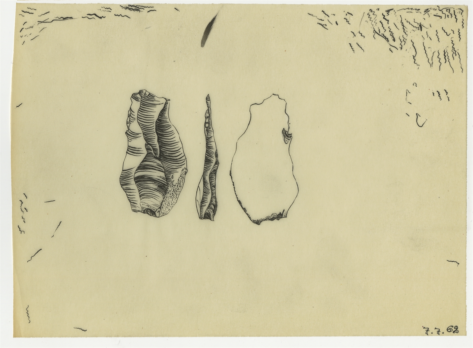Zbiór rysunków zabytków krzemiennych wykonanych na 35 kalkach przez Z. Szmita oraz J. Morgana w okresie maj-lipiec 1962 r. - kalka 29: rysunek zabytku krzemiennego w trzech rzutach 7.7.[19]62
