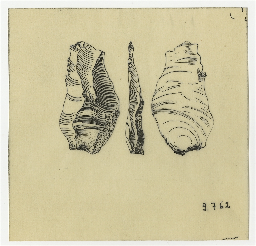 Zbiór rysunków zabytków krzemiennych wykonanych na 35 kalkach przez Z. Szmita oraz J. Morgana w okresie maj-lipiec 1962 r. - kalka 31: rysunek zabytku krzemiennego w trzech rzutach 9.7.[19]62
