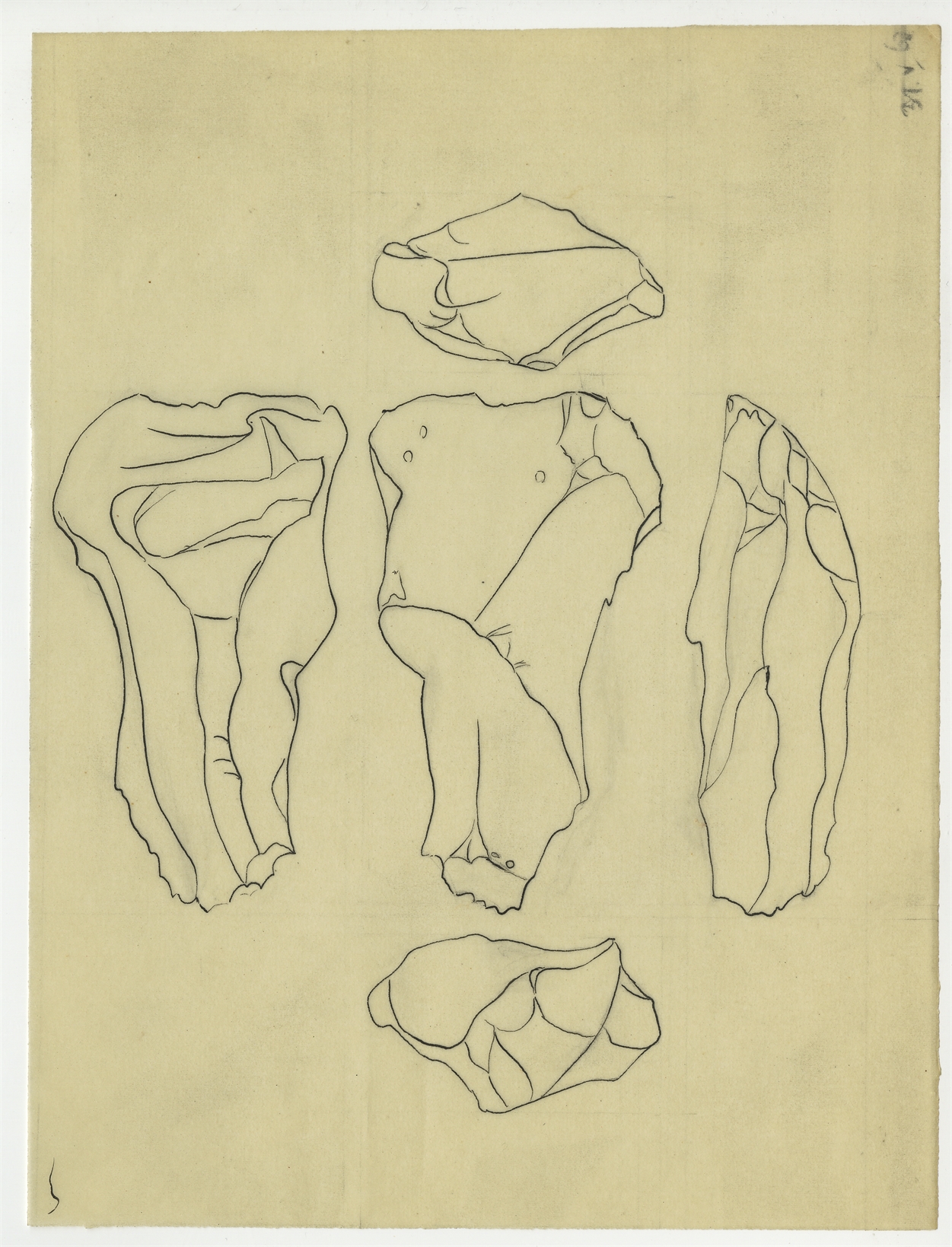 Zbiór rysunków zabytków krzemiennych wykonanych na 35 kalkach przez Z. Szmita oraz J. Morgana w okresie maj-lipiec 1962 r. - kalka 4: rysunek zabytku krzemiennego w pięciu rzutach 31 V [19]62