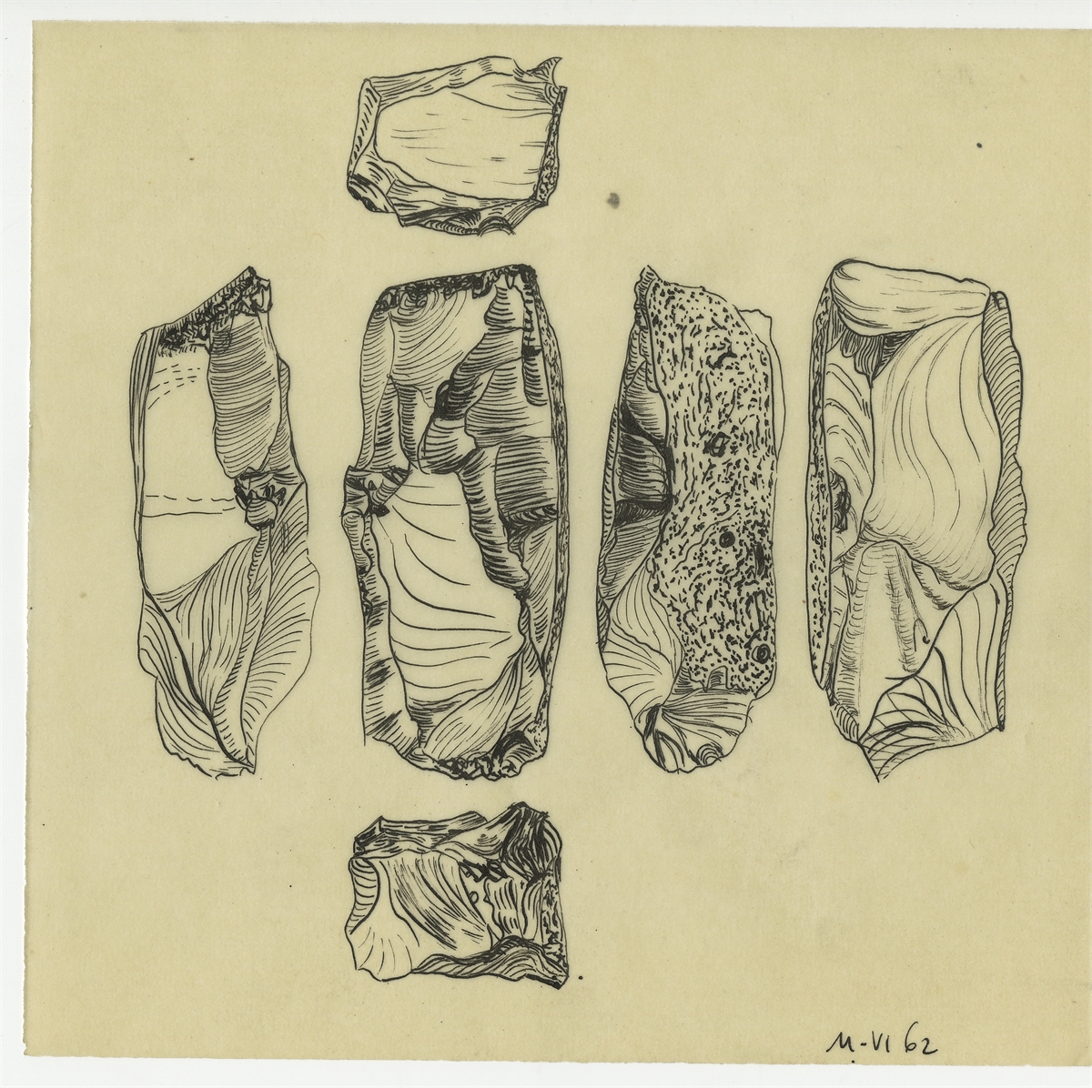 Zbiór rysunków zabytków krzemiennych wykonanych na 35 kalkach przez Z. Szmita oraz J. Morgana w okresie maj-lipiec 1962 r. - kalka 7: rysunek zabytku krzemiennego w sześciu rzutach 11 VI [19]62