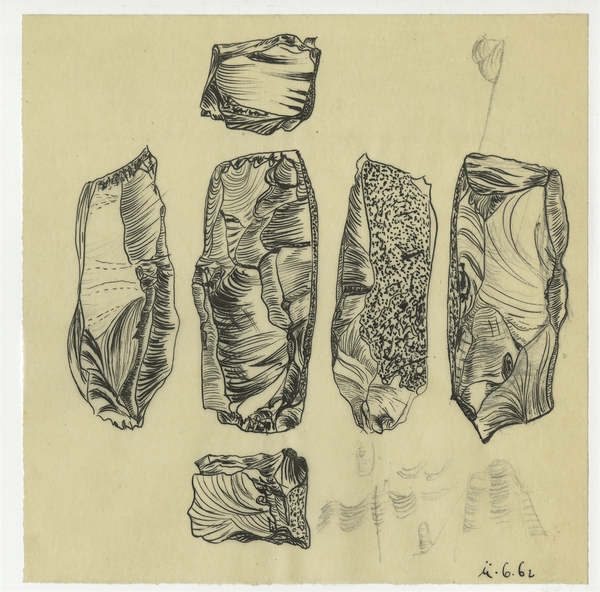 Zbiór rysunków zabytków krzemiennych wykonanych na 35 kalkach przez Z. Szmita oraz J. Morgana w okresie maj-lipiec 1962 r. - kalka 8: rysunek zabytku krzemiennego w sześciu rzutach 11.6.[19]62