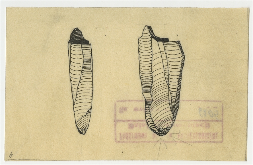 Zbiór rysunków zabytków krzemiennych wykonanych przez P. Dyniewiczówną zebranych w jednej kopercie opisanej ręką Stefana Krukowksiego "Rysunki P. Dyniewiczównej" - strona 11: rysunek zabytku krzemiennego w dwóch rzutach