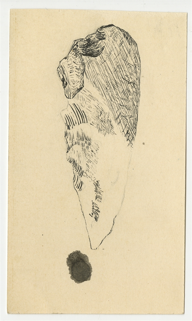 Zbiór rysunków zabytków krzemiennych wykonanych przez P. Dyniewiczówną zebranych w jednej kopercie opisanej ręką Stefana Krukowksiego "Rysunki P. Dyniewiczównej" - strona 4: rysunek zabytku krzemiennego