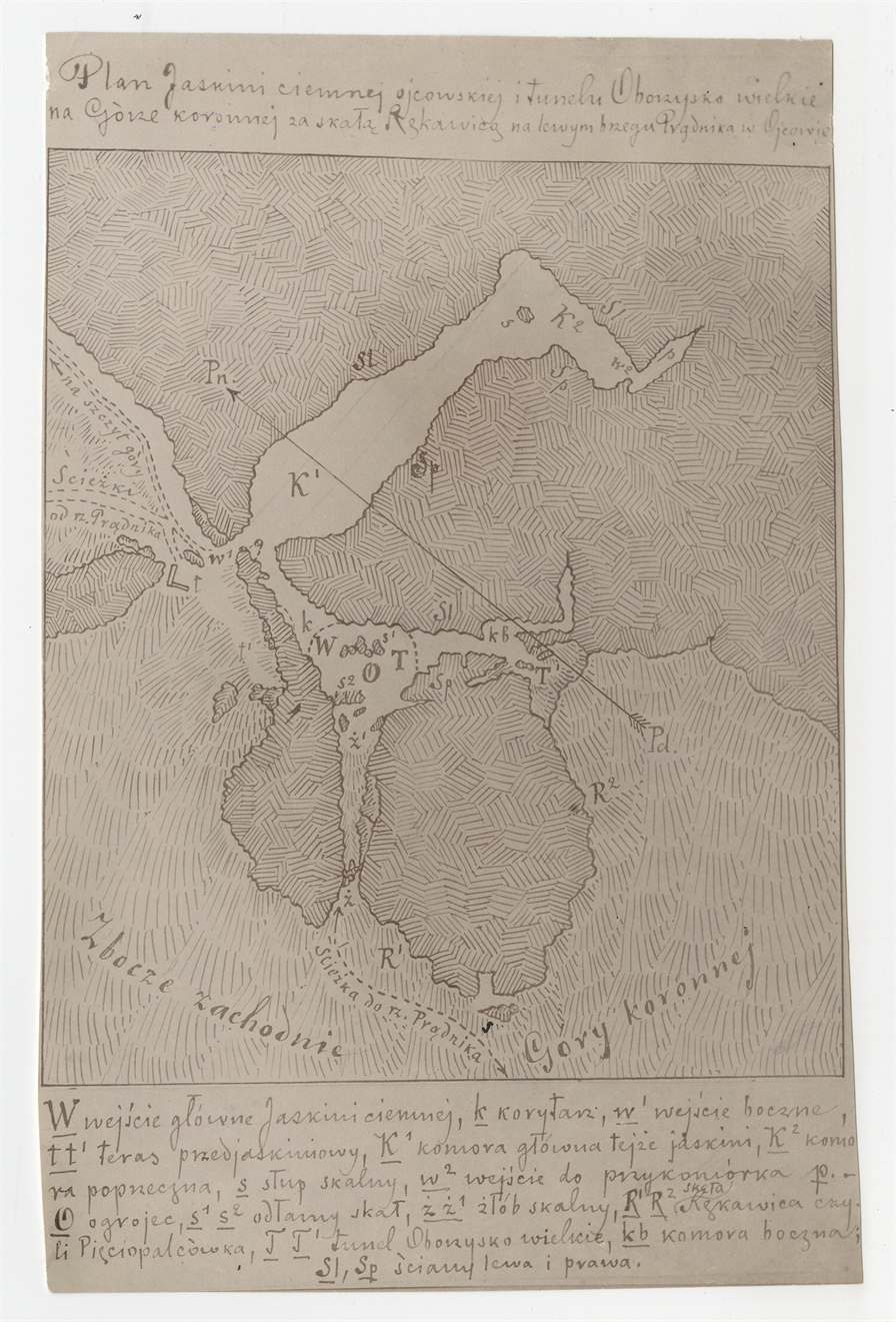 Zdjęcie zatytułowane "Plan jaskini ciemnej ojcowskiej i tunelu Oborzysko wielkie na Górze Koronnej za skałą Rękawicą na lewym brzegu Prądnika w Ojcowie"