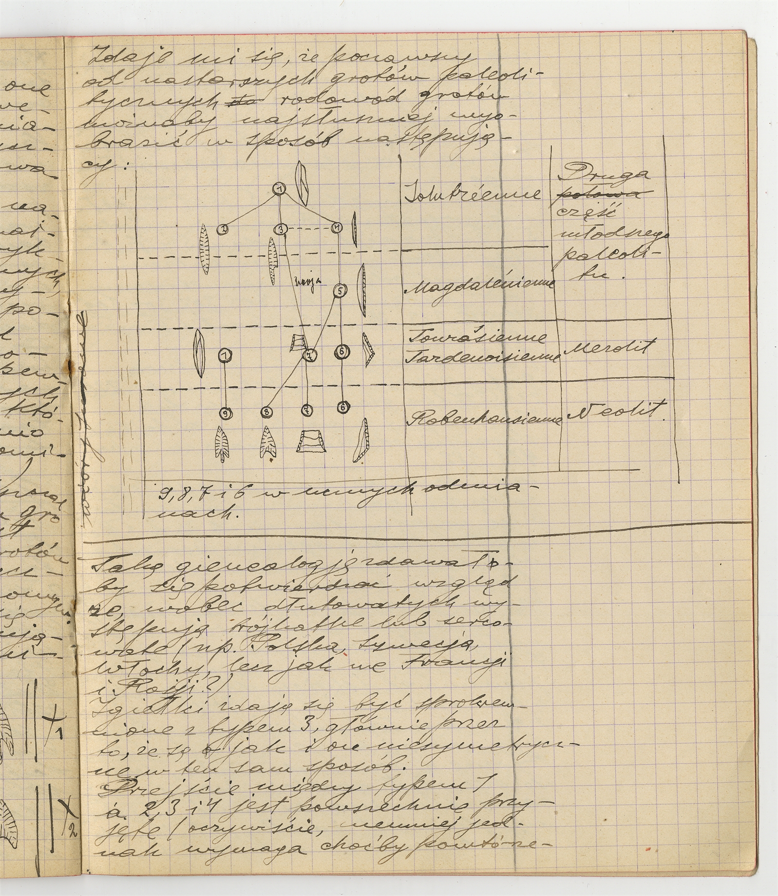 Zeszyt z rękopisem pracy o narzędziach - strona 22: treść pracy S. Krukowskiego (bez tytułu): "Genealogia grotów" c..d