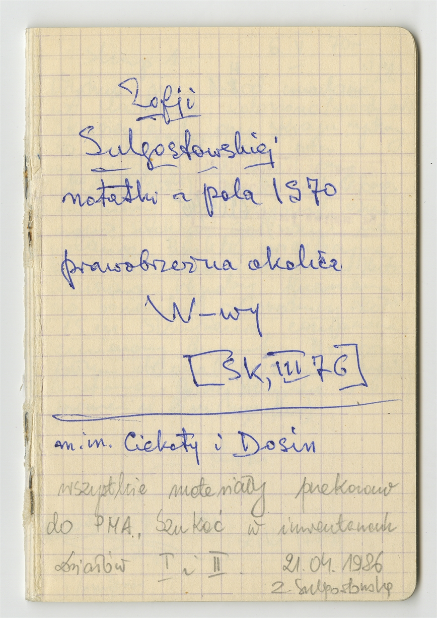 Zofii Sulgostowskiej notatki z pola 1970 - prawobrzeżna okolica W-wy sporządzone w notesie w kratkę - strona 1: zatytułowana przez S. Krukowskiego [SK III 76] zawiera późniejszy dopisek Zofii Sulgostowskiej III [19]76 21. 04. 1986