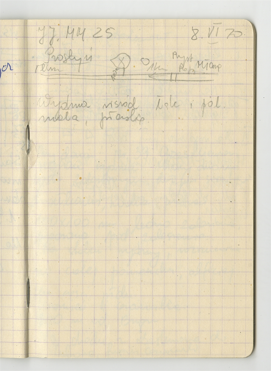 Zofii Sulgostowskiej notatki z pola 1970 - prawobrzeżna okolica W-wy sporządzone w notesie w kratkę - strona 10: zatytułówana "JJ. MM 25" szkic sytuacyjny stanowiska 8. VI [19]70 (bez numeru strony)