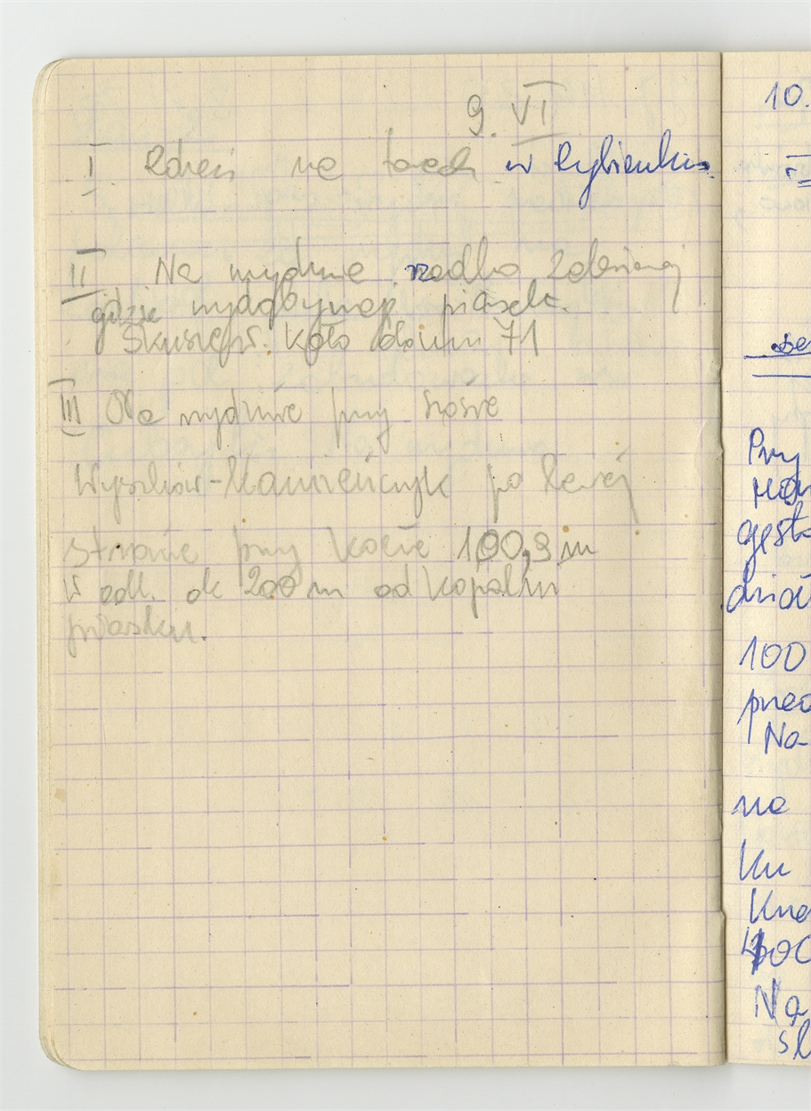 Zofii Sulgostowskiej notatki z pola 1970 - prawobrzeżna okolica W-wy sporządzone w notesie w kratkę - strona 11: "Rdzeń na (…) w Rybienku" … "200 m od kopalni piasku" 9 VI [1970] (bez numeru strony)