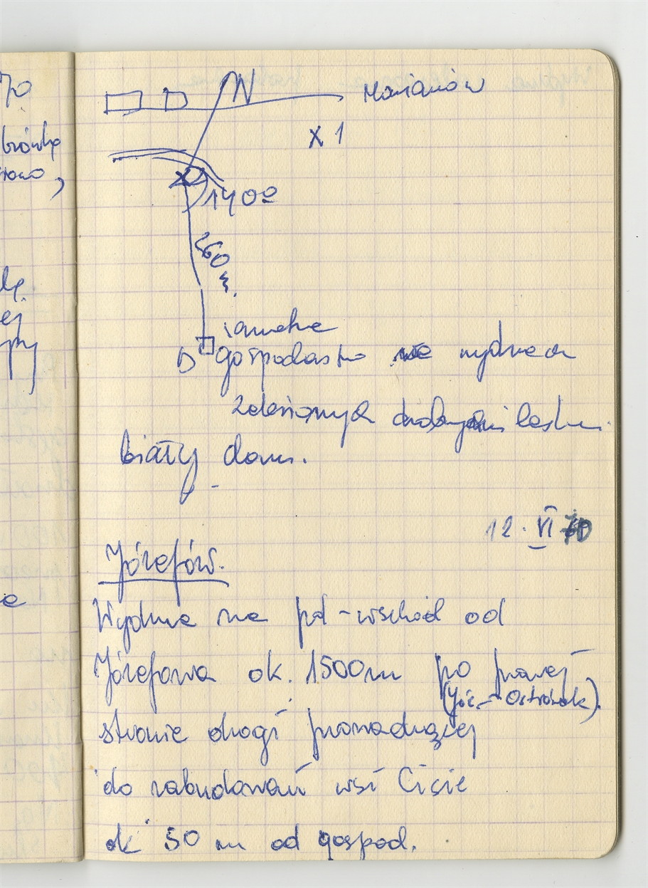 Zofii Sulgostowskiej notatki z pola 1970 - prawobrzeżna okolica W-wy sporządzone w notesie w kratkę - strona 14: szkic sytuacyjny stanowiska w Marianowie "Józefów - Wydma na pd-wschód (…) … "ok. 50 m od gospod." 12. VI [19]70 (bez numeru strony)