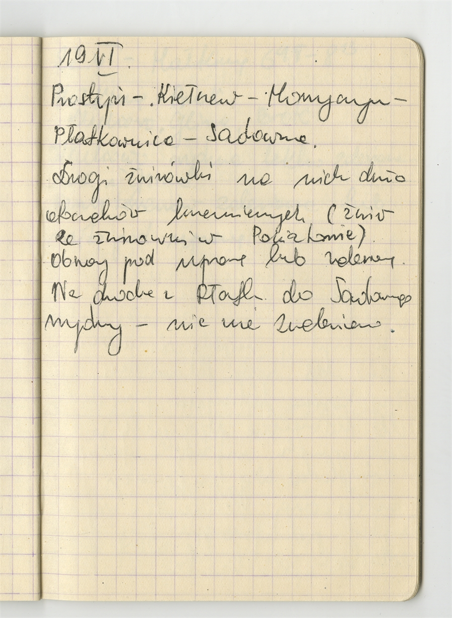 Zofii Sulgostowskiej notatki z pola 1970 - prawobrzeżna okolica W-wy sporządzone w notesie w kratkę - strona 16: "Prostyń - Kiełrzew (…) … "-nie zrobiono" 19 VI [1970] (bez numeru strony)