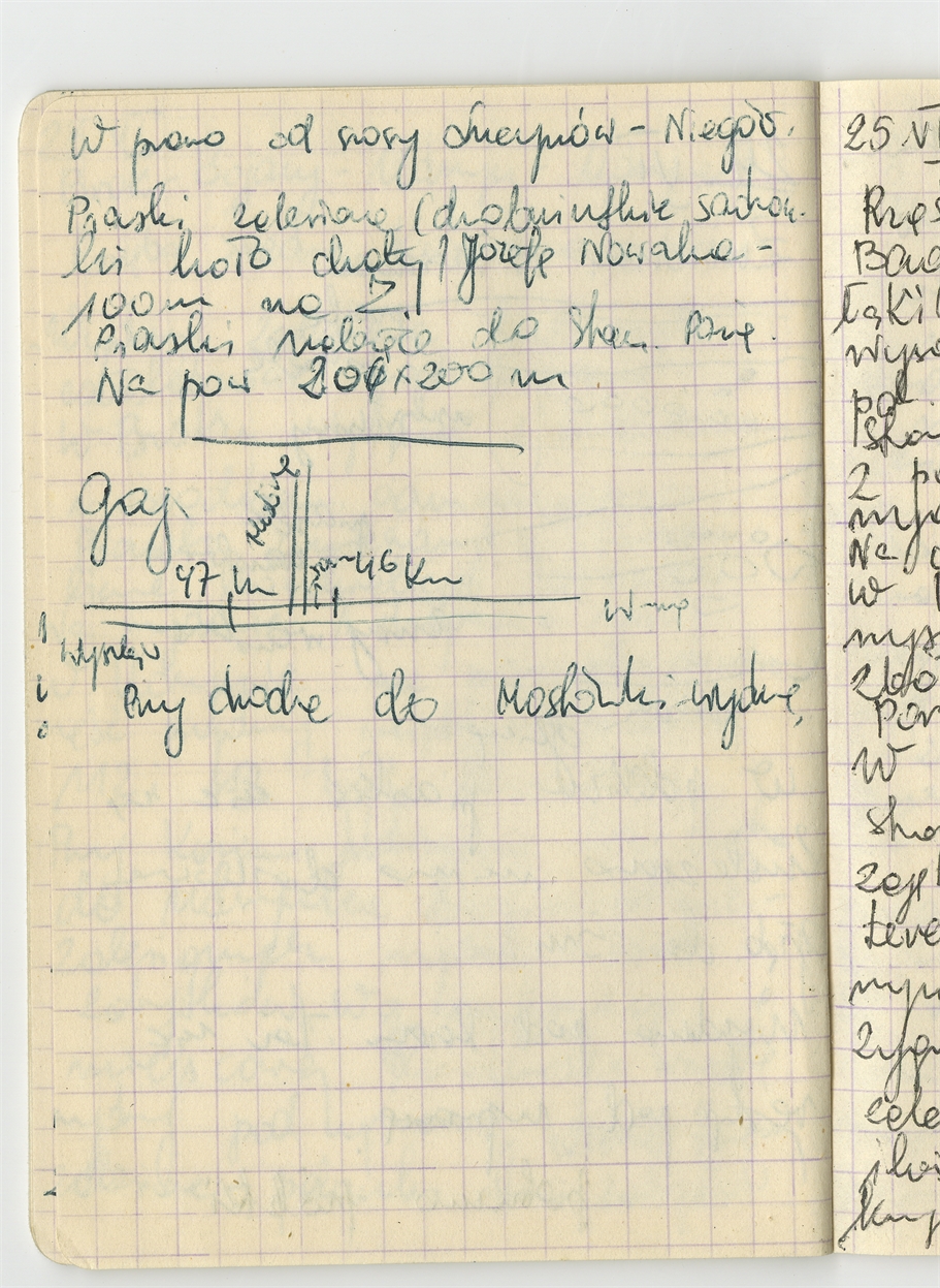 Zofii Sulgostowskiej notatki z pola 1970 - prawobrzeżna okolica W-wy sporządzone w notesie w kratkę - strona 20: zatytułowana "W prawo od szosy Lucynów - Niegów" 'Piaski zalesione" … Na pow. 200 x 200 m" szkic sytuacyjny stanowiska (bez numeru strony)