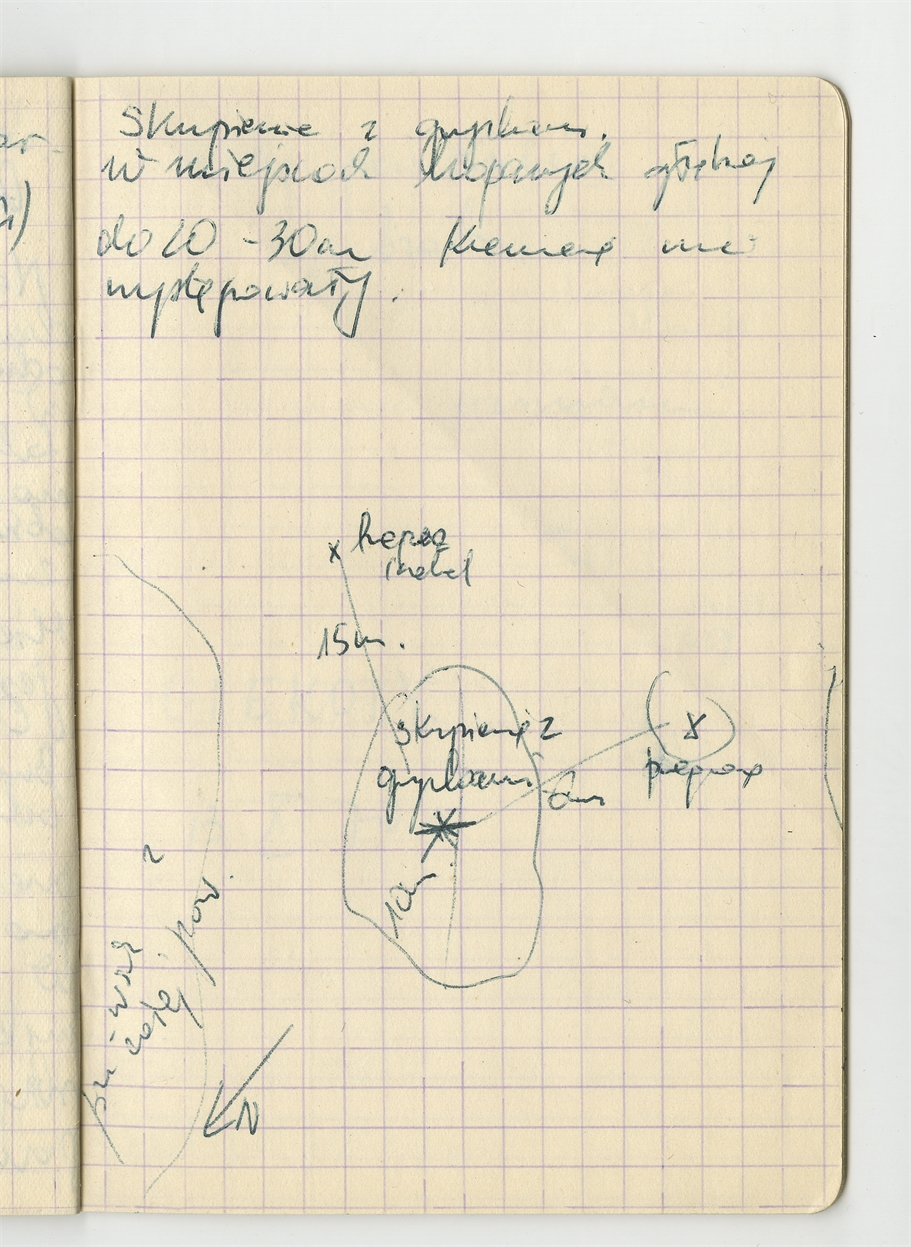 Zofii Sulgostowskiej notatki z pola 1970 - prawobrzeżna okolica W-wy sporządzone w notesie w kratkę - strona 25: "skupienie z ( )i" … "Krzemienie nie występowały" poniżej szkic sytuacyjny (bez numeru strony)