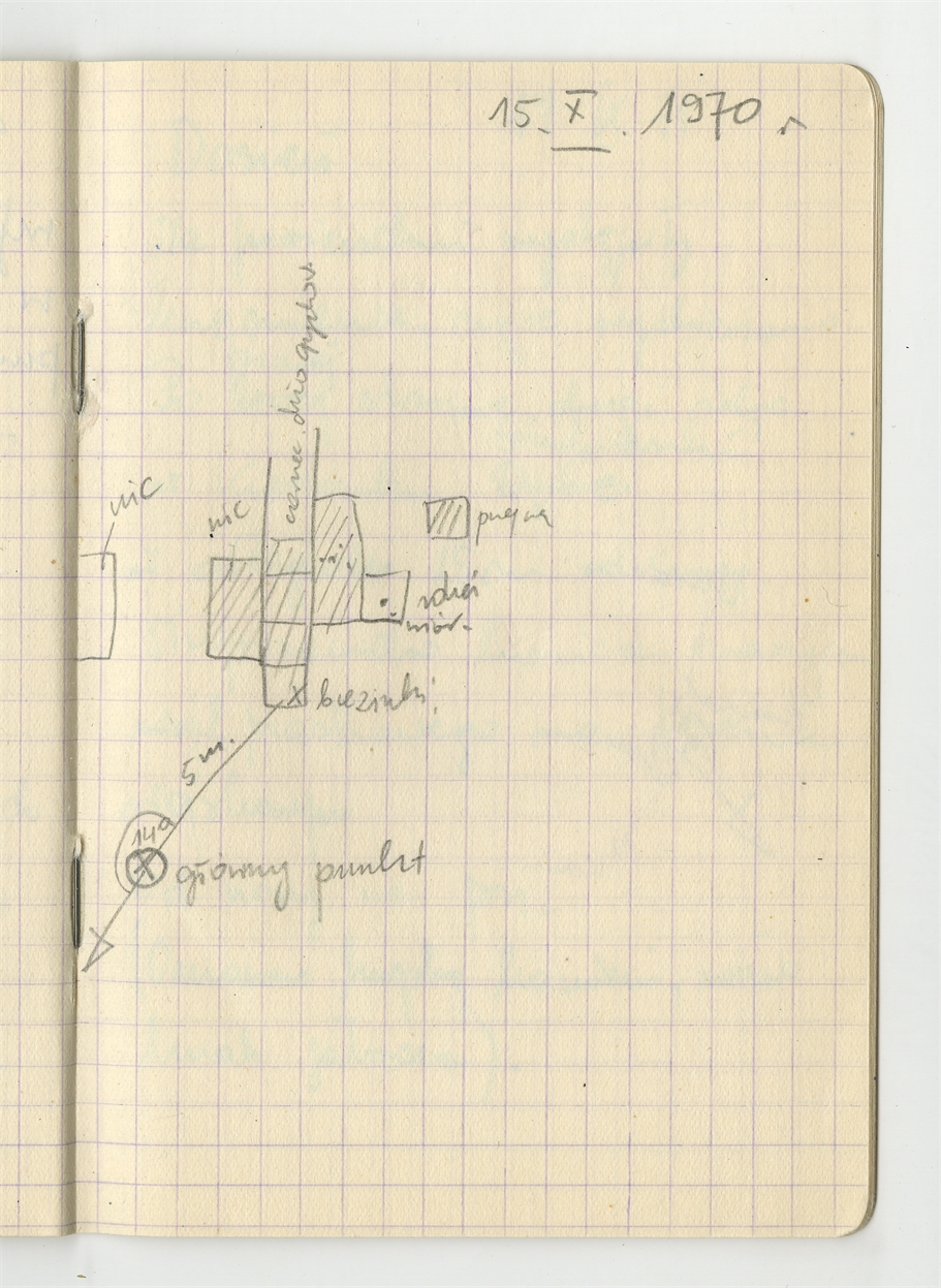 Zofii Sulgostowskiej notatki z pola 1970 - prawobrzeżna okolica W-wy sporządzone w notesie w kratkę - strona 32: zawiera nieoktreślony szkic sytuacyjny 15 X 1970 (bez numeru strony)
