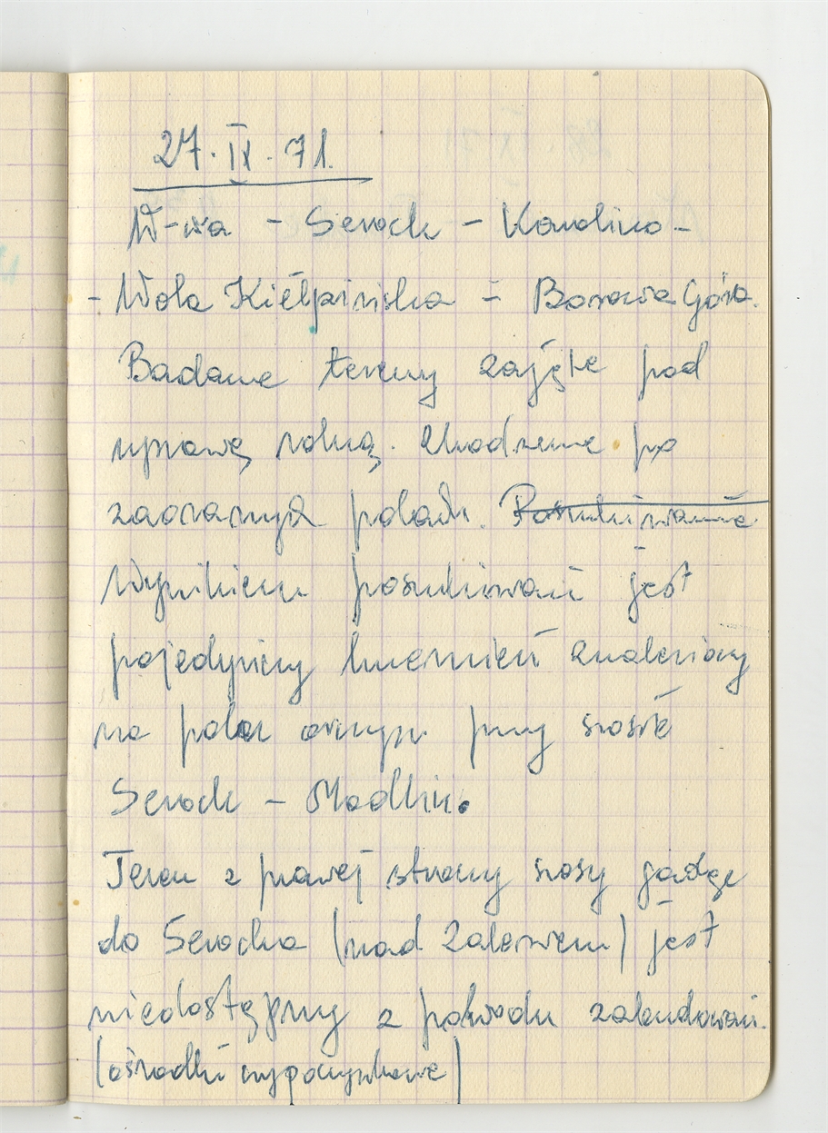 Zofii Sulgostowskiej notatki z pola 1970 - prawobrzeżna okolica W-wy sporządzone w notesie w kratkę - strona 38: zatytułowana "W-wa - Serock - Karolino - Wola Kiełpińska - Borowa Góra" "Badane tereny" … "(ośrodki wypoczynkowe)" 27 IX [19]71