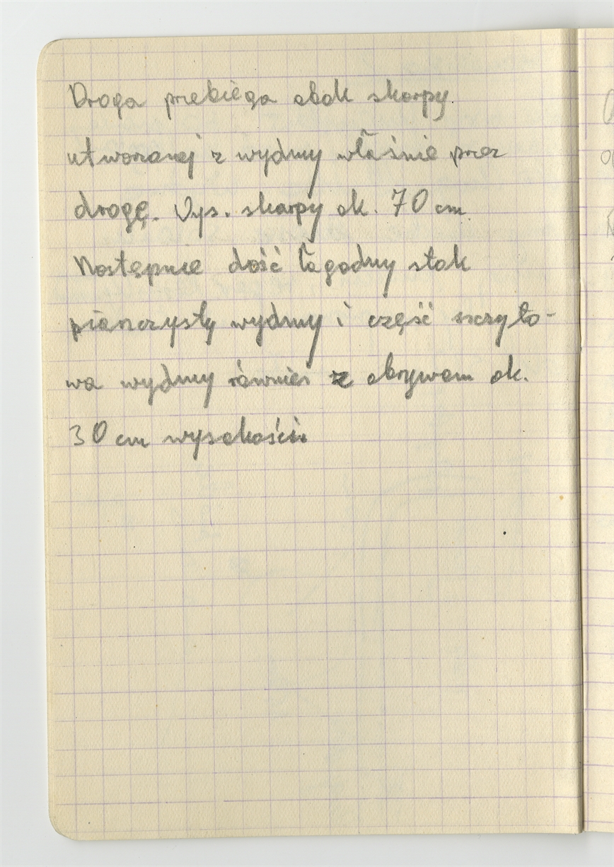 Zofii Sulgostowskiej notatki z pola 1970 - prawobrzeżna okolica W-wy sporządzone w notesie w kratkę - strona 4: "Droga przebiega" … "ok.. 30 cm wysokości"(bez numeru strony)