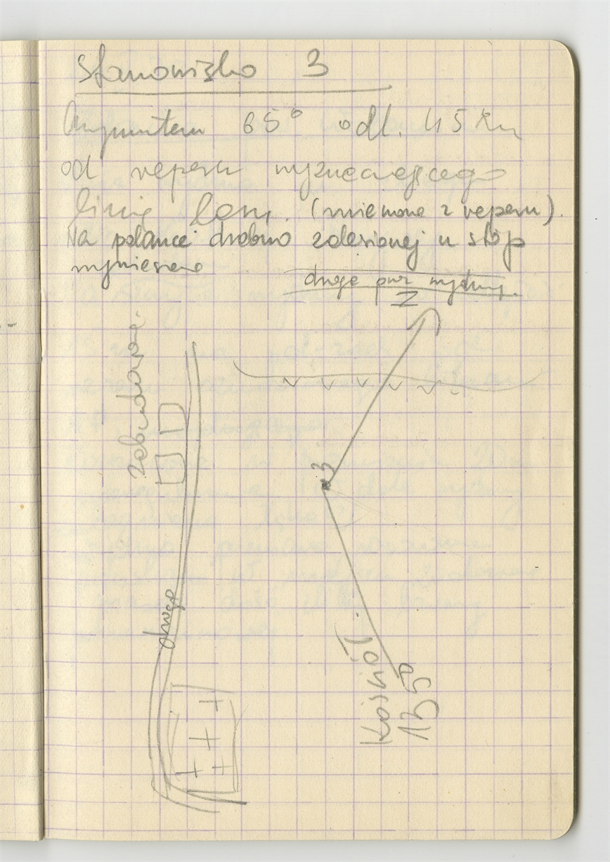 Zofii Sulgostowskiej notatki z pola 1970 - prawobrzeżna okolica W-wy sporządzone w notesie w kratkę - strona 5: zatytułowana "stanowisko 3" "Azymutem 65°" … "drobno zalesionej u stóp (…)" poniżej szkic sytuacyjny stanowiska (bez numeru strony)